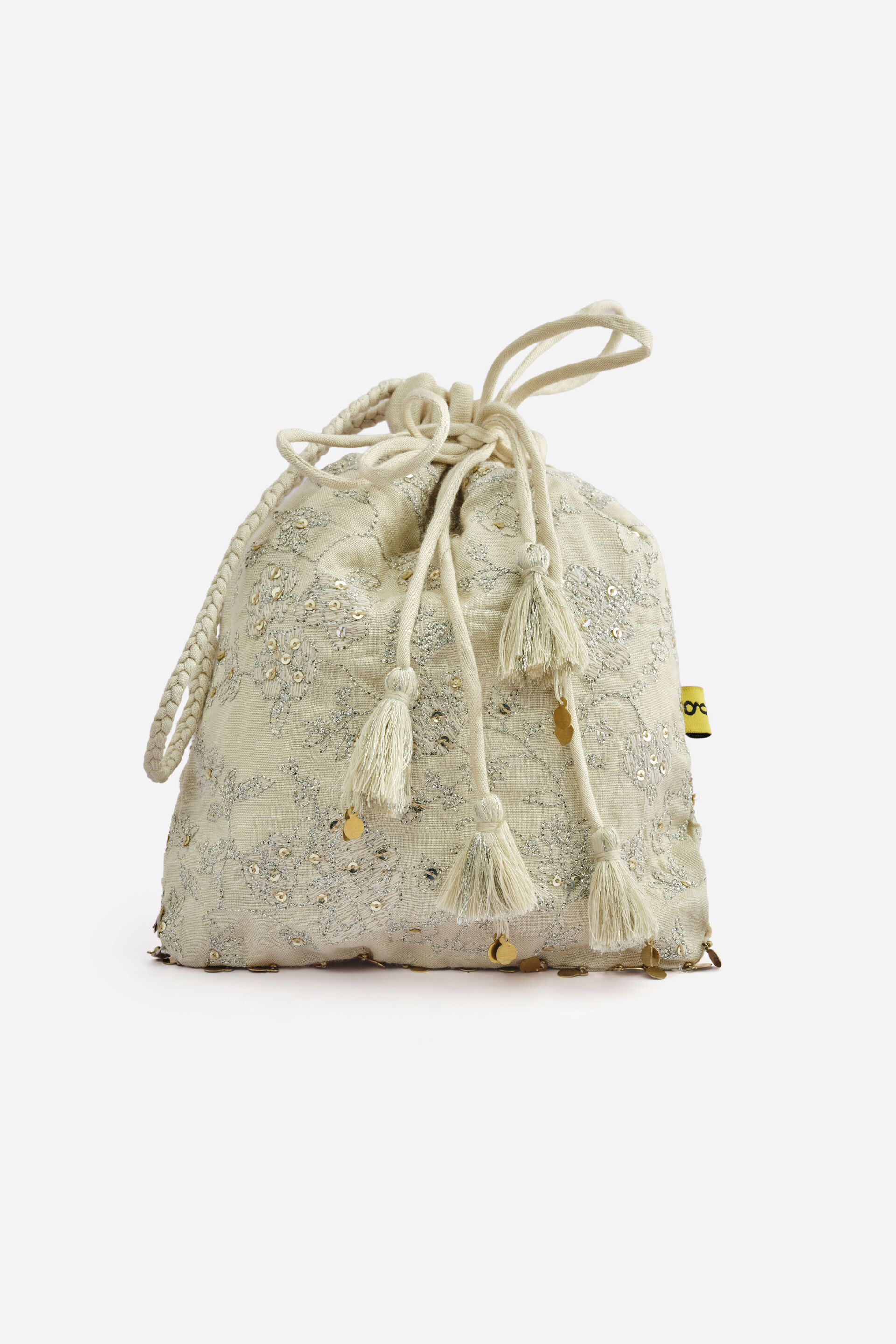 Potli bag in a soft gold tone, made with intricate zari and thread-work that adds subtle texture and depth. Designed with braided drawstrings and tassel detailing, the piece combines functionality with an elevated, occasion-ready finish.