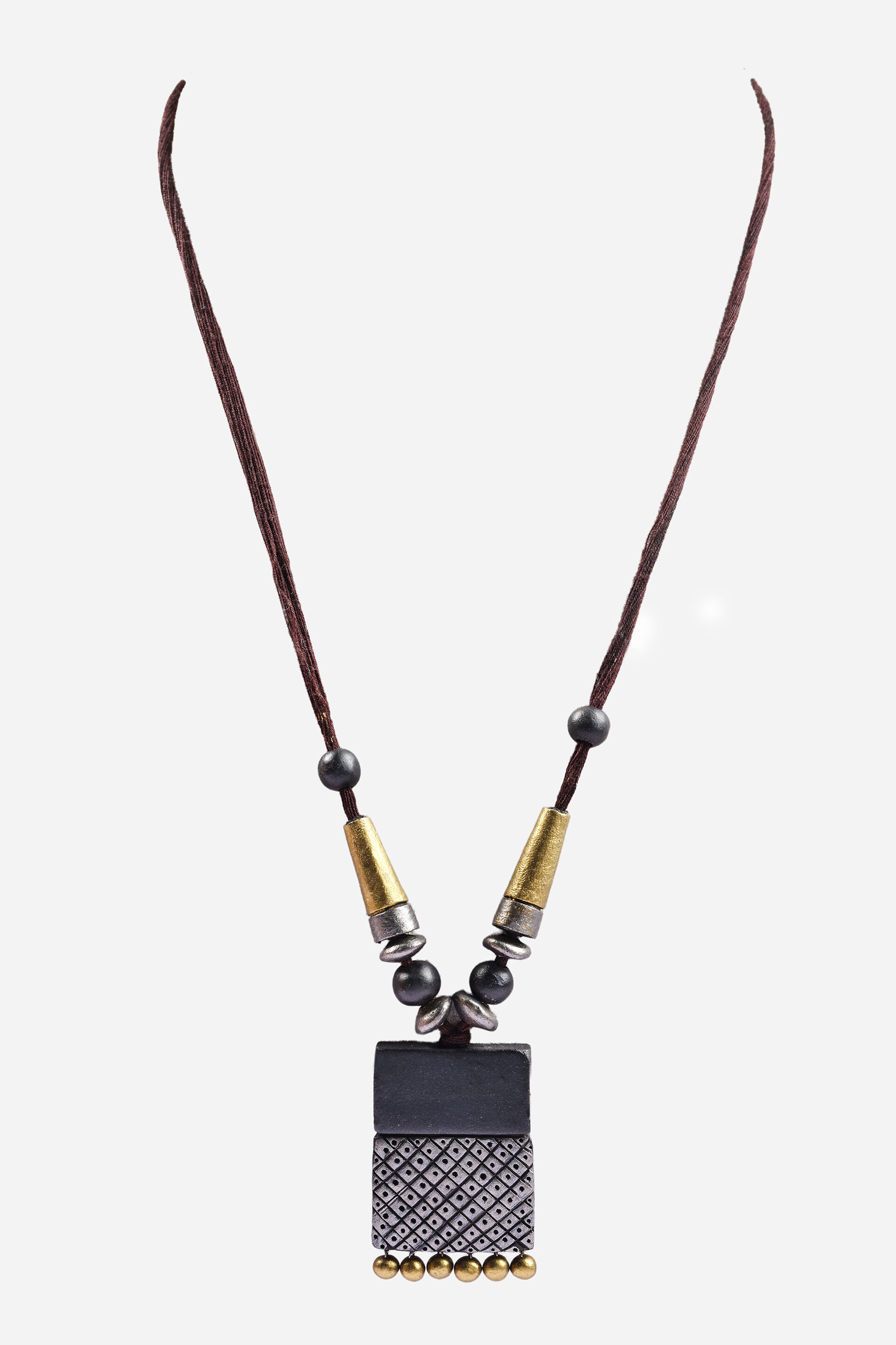A colourful clay-and-thread pendant necklace designed to sit elegantly. Adjustable and easy to style, it pairs well with both simple tops and festive dresses.