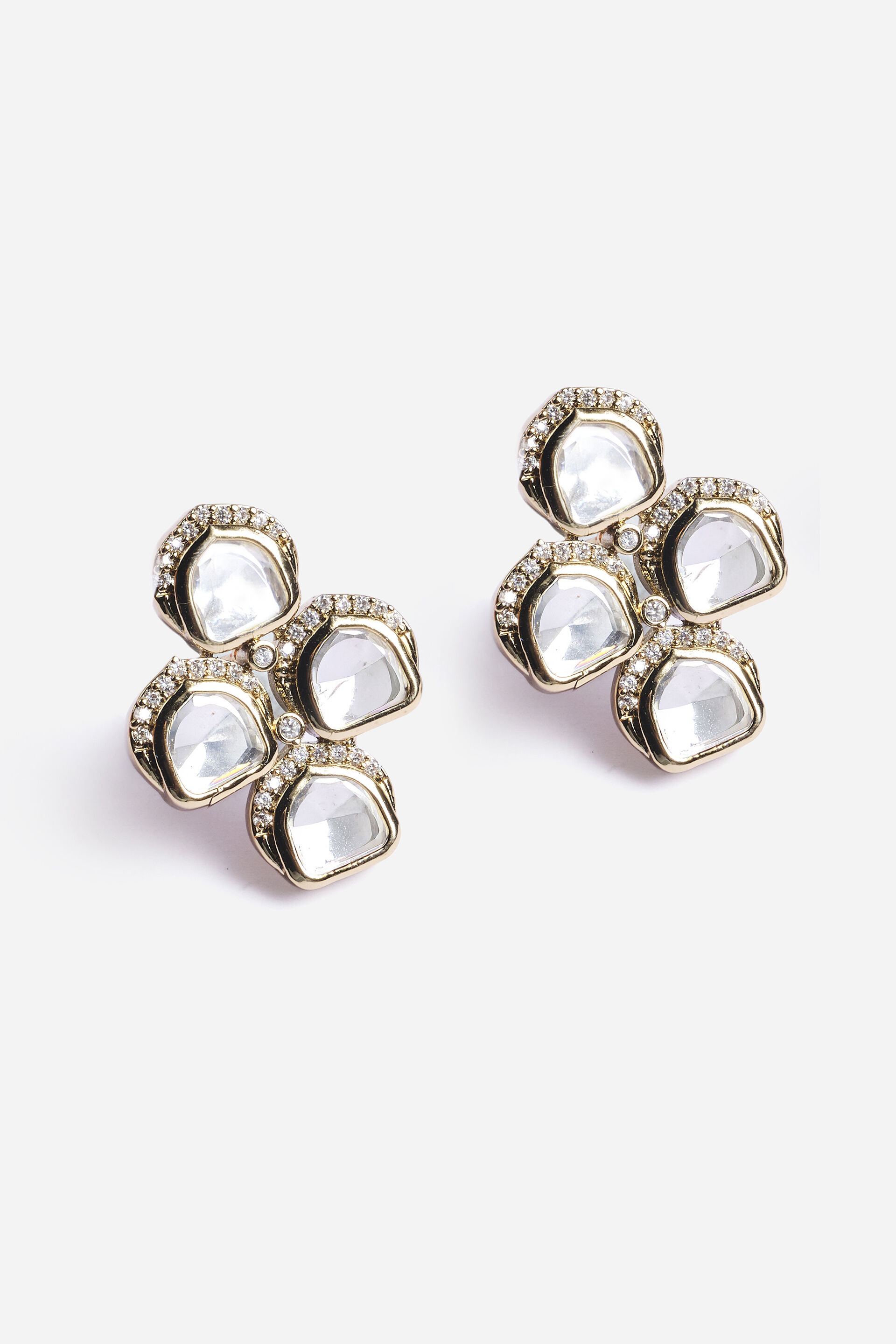 Brass studs designed with four transparent stones surrounded by a clear border for a refined, luminous look. Perfect for festive wear or special occasions, they bring effortless shine to any ensemble.