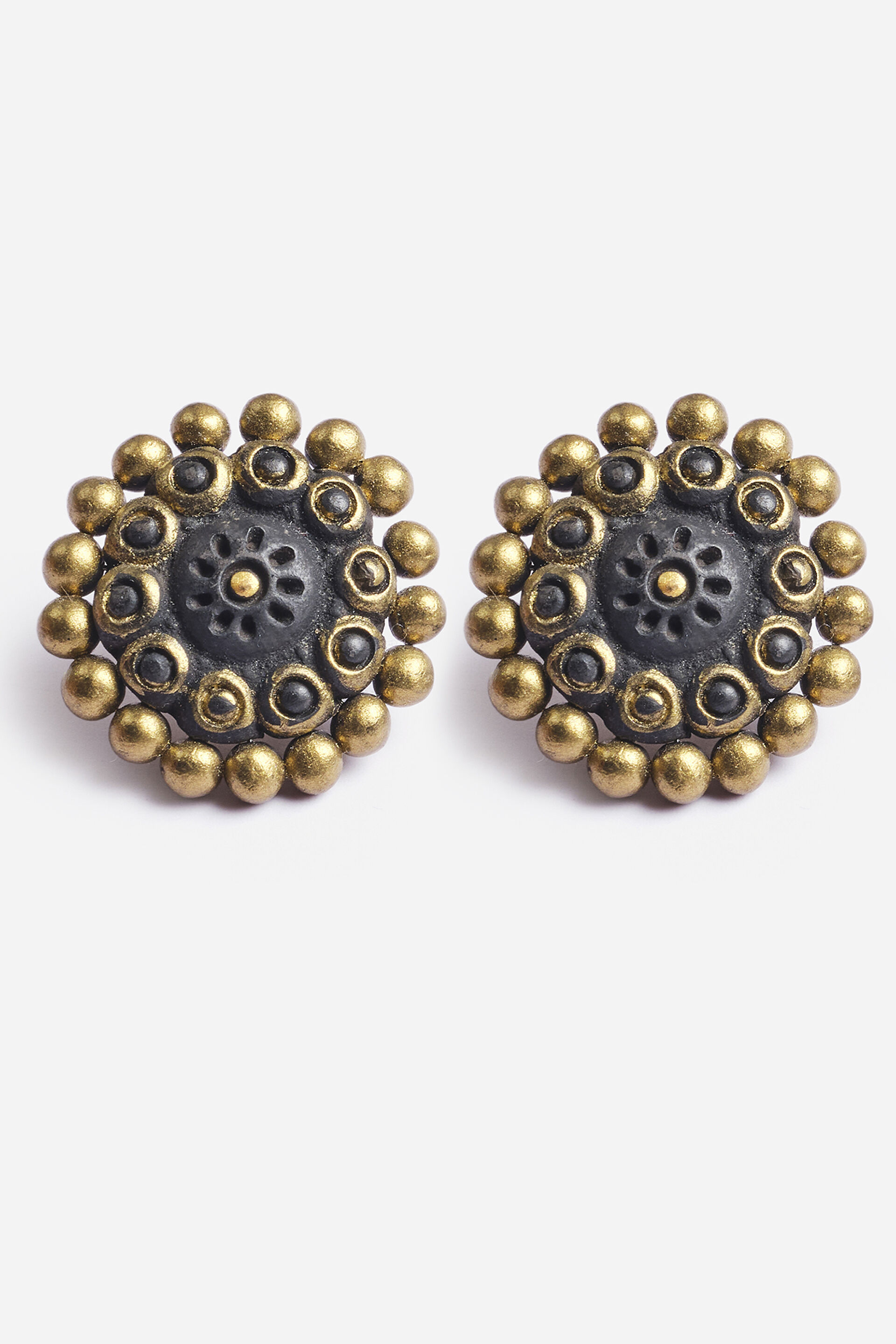 Multi-hued studs in black and gold tones, made with clay, thread, and brass. Small yet striking, they bring just the right touch of detail to casual and festive outfits.