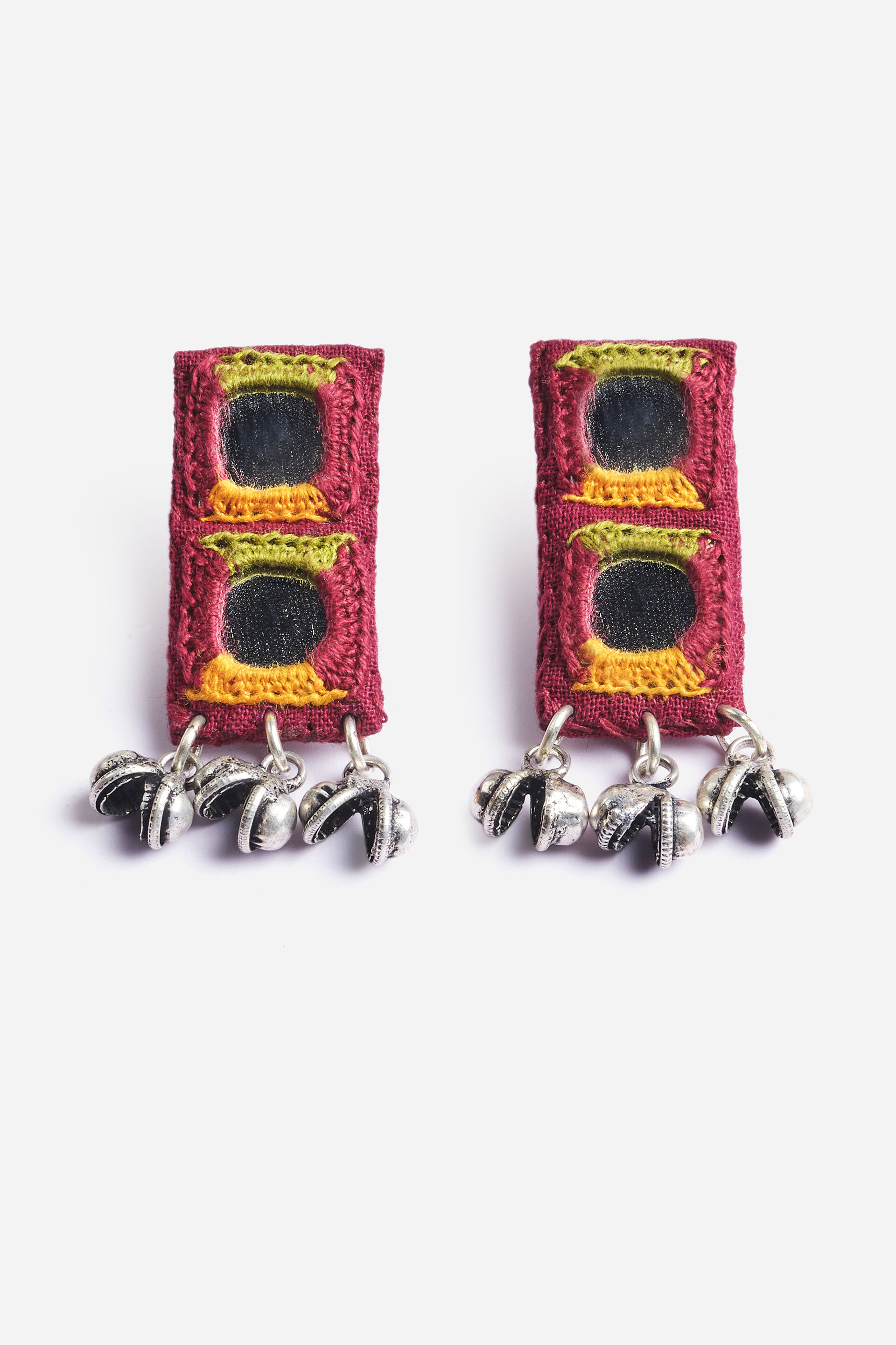 A festive favourite, the Mirror & Ghungroo Earrings bring together fabric, mirrors, and silver-toned alloy with tiny ghungroos for added charm. Lightweight yet statement-making, these studs are perfect to style with ethnic sets, dupattas, or draped sarees.