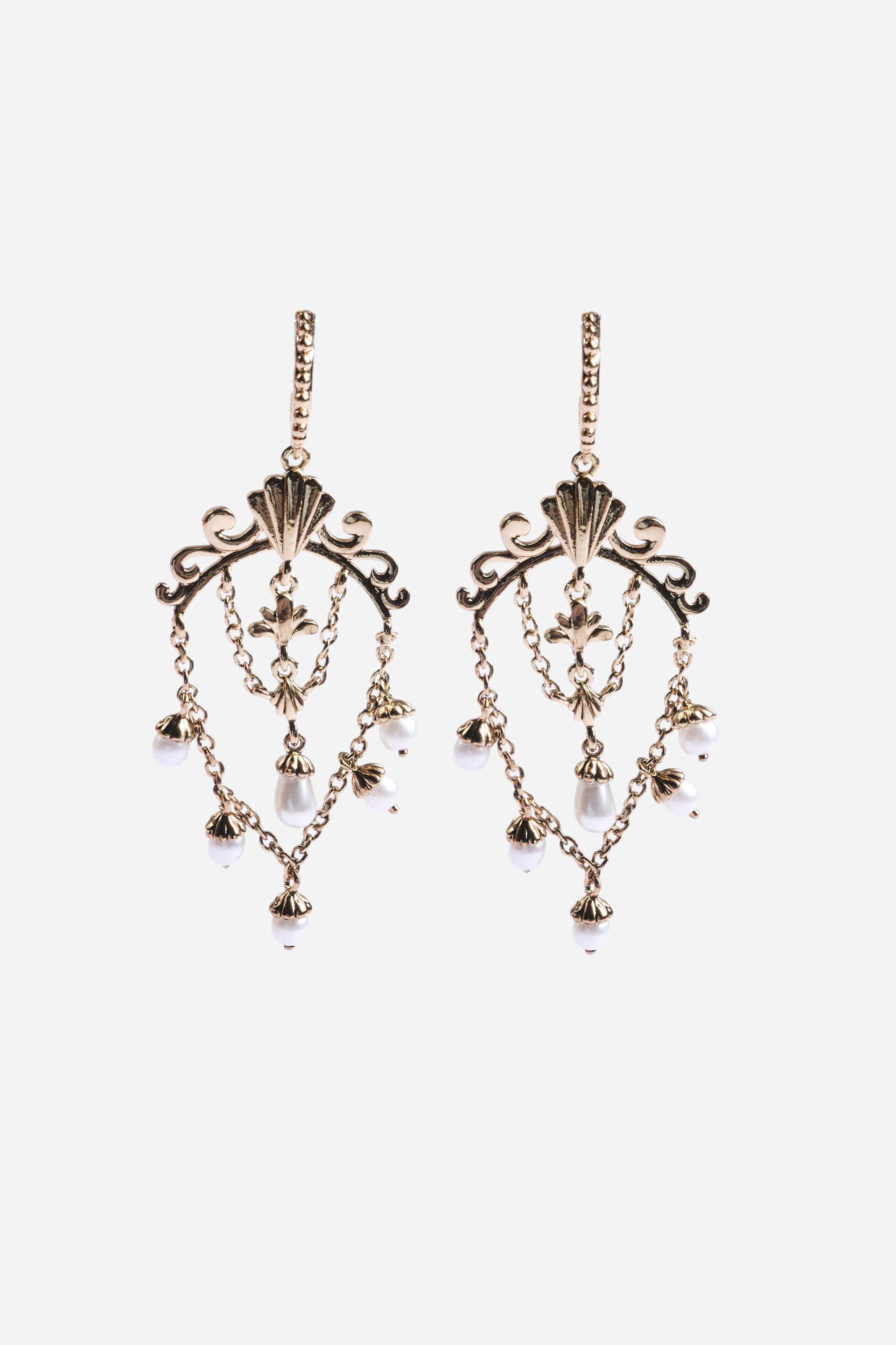 Classic festive danglers in gold, detailed with white moti. Stunning and graceful, they bring a traditional charm to festive and wedding looks.
