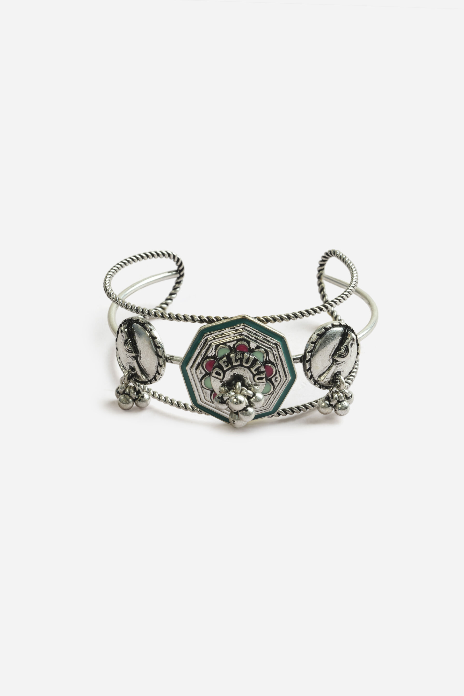 Antique silver-plated cuff bracelet featuring a central silver bead cluster set within a geometric enamel panel in a structured open design.