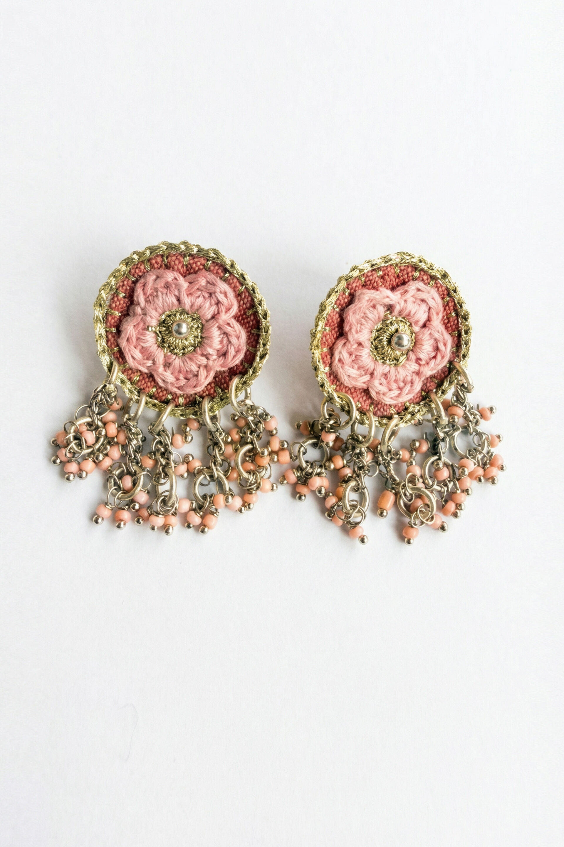 Pink studs made with fabric, thread, silver elements, glass beads, and zari thread with bead tassel detailing.