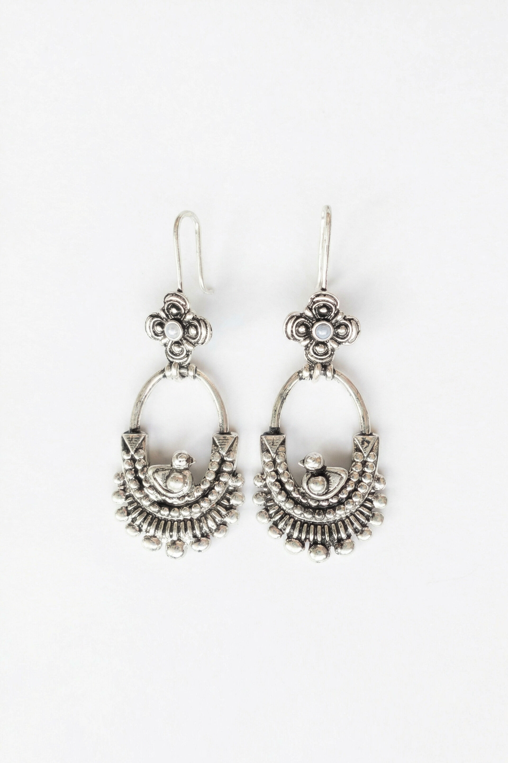 Antique silver-tone brass dangler earrings with crescent-shaped detailing and bead fringe accents.