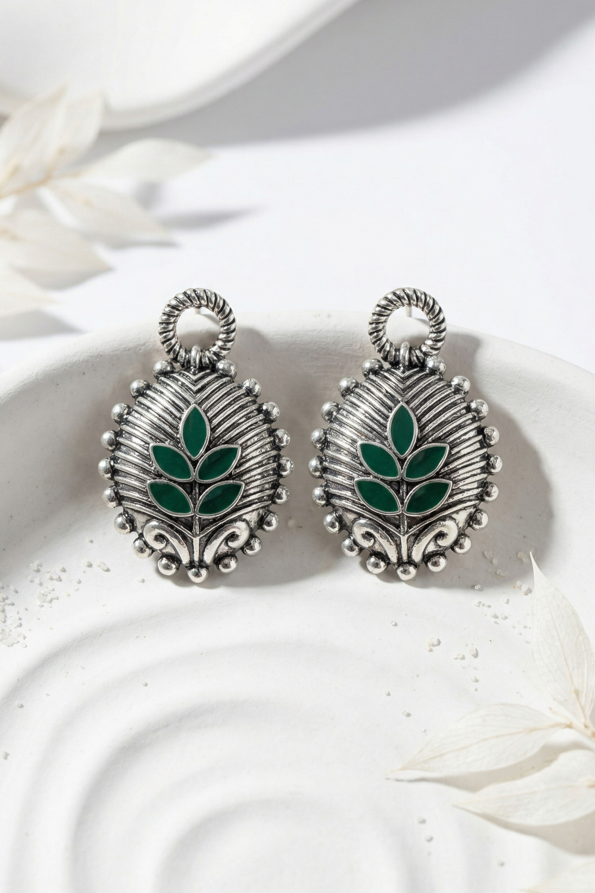 Antique silver-tone brass stud earrings featuring a green leaf motif in a round frame design.
