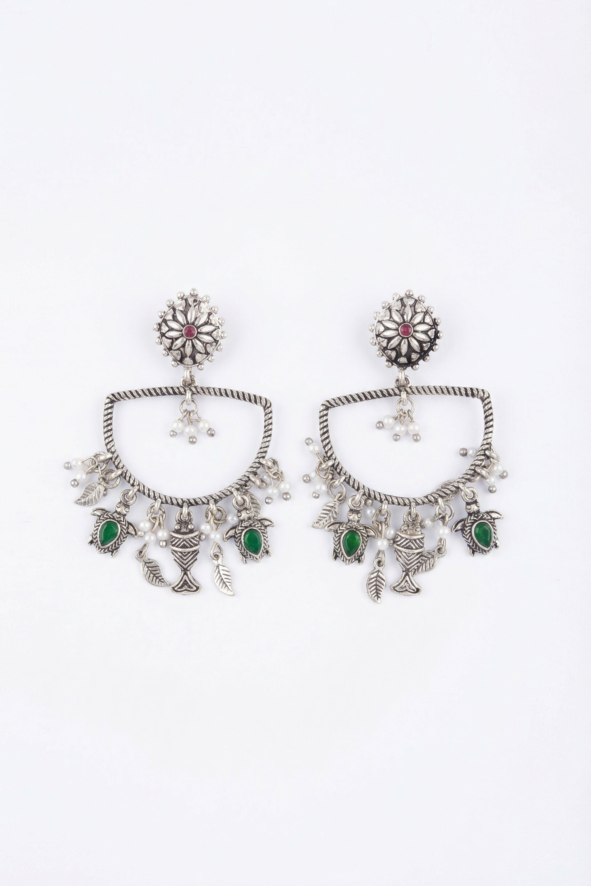 Antique silver-tone brass dangler earrings featuring green stone accents, arch detailing, pearls and bead fringe elements.