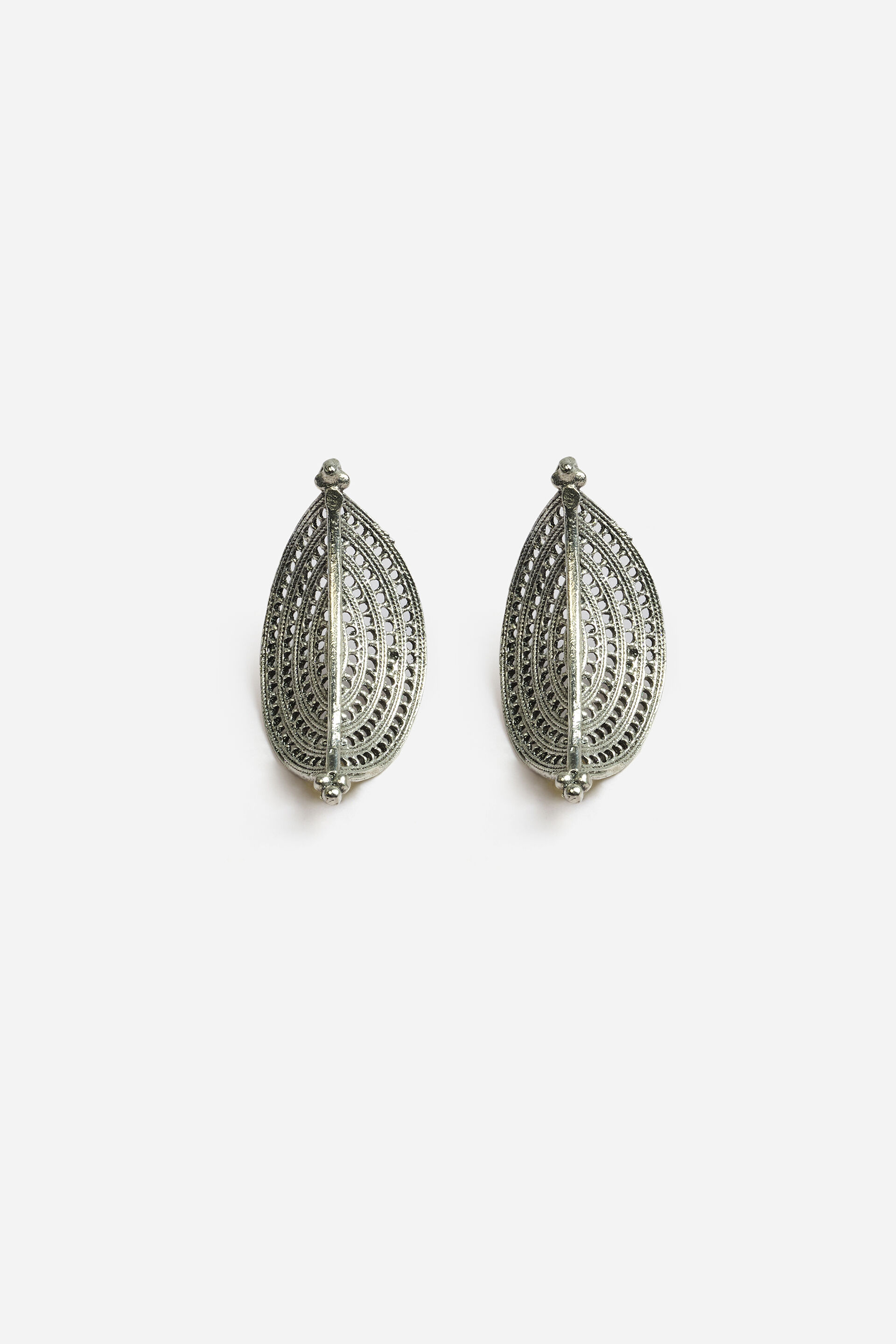 Oxidised silver-tone brass drop earrings in a textured leaf-shaped design.