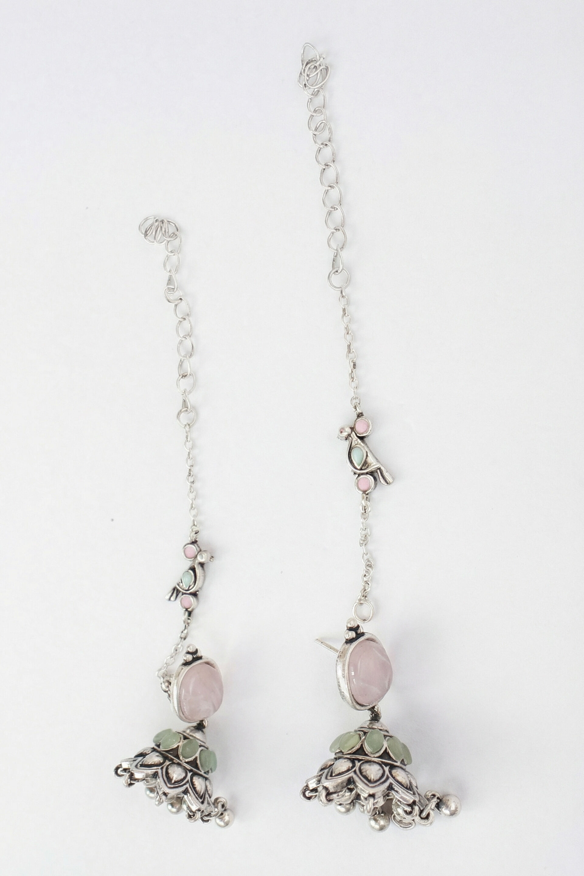 Antique silver-tone brass dangler earrings featuring pink stone accents with bird detailing and bead fringe elements.