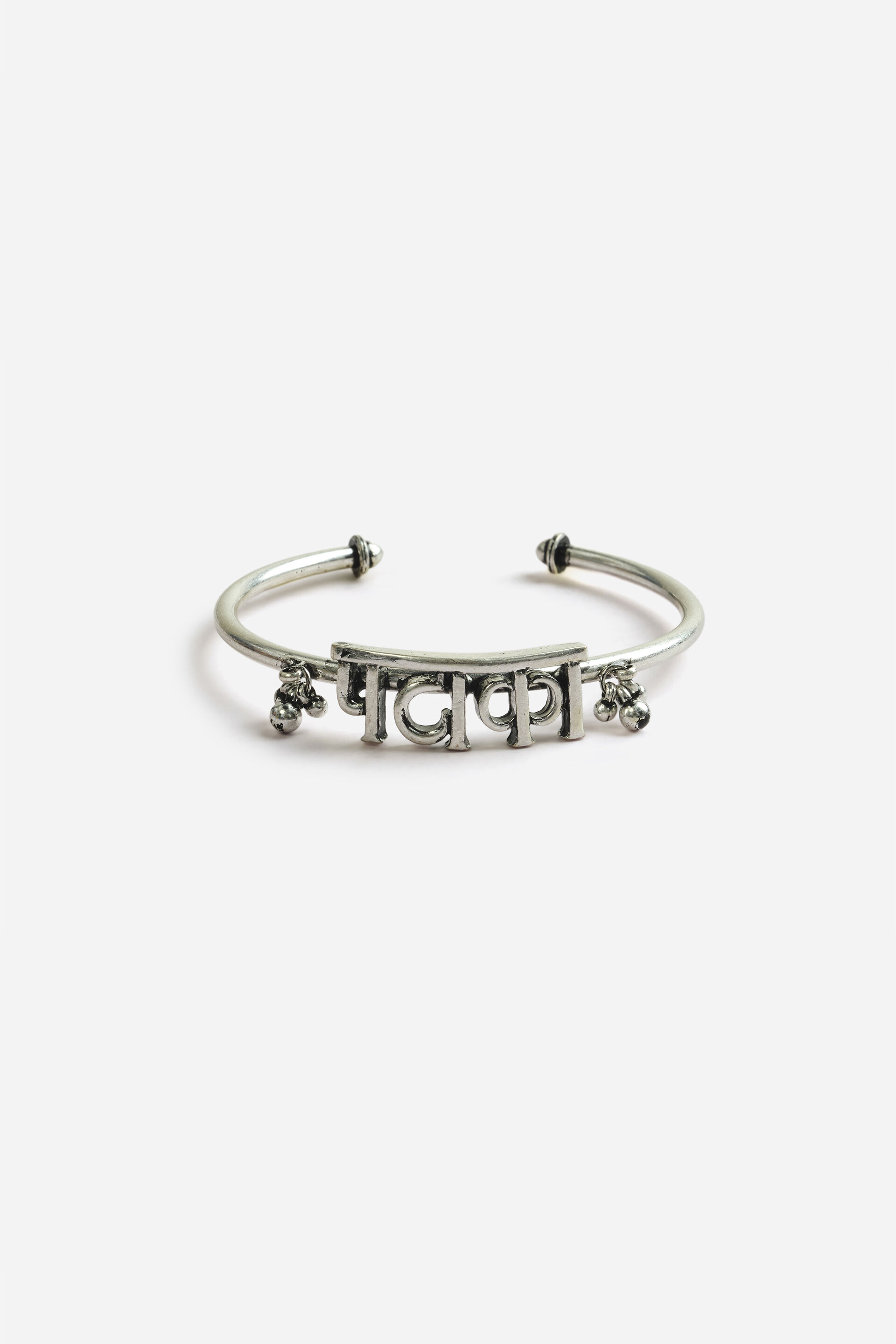 Antique silver-plated cuff bracelet featuring a raised “Patakha” word design with silver beads on the sides.