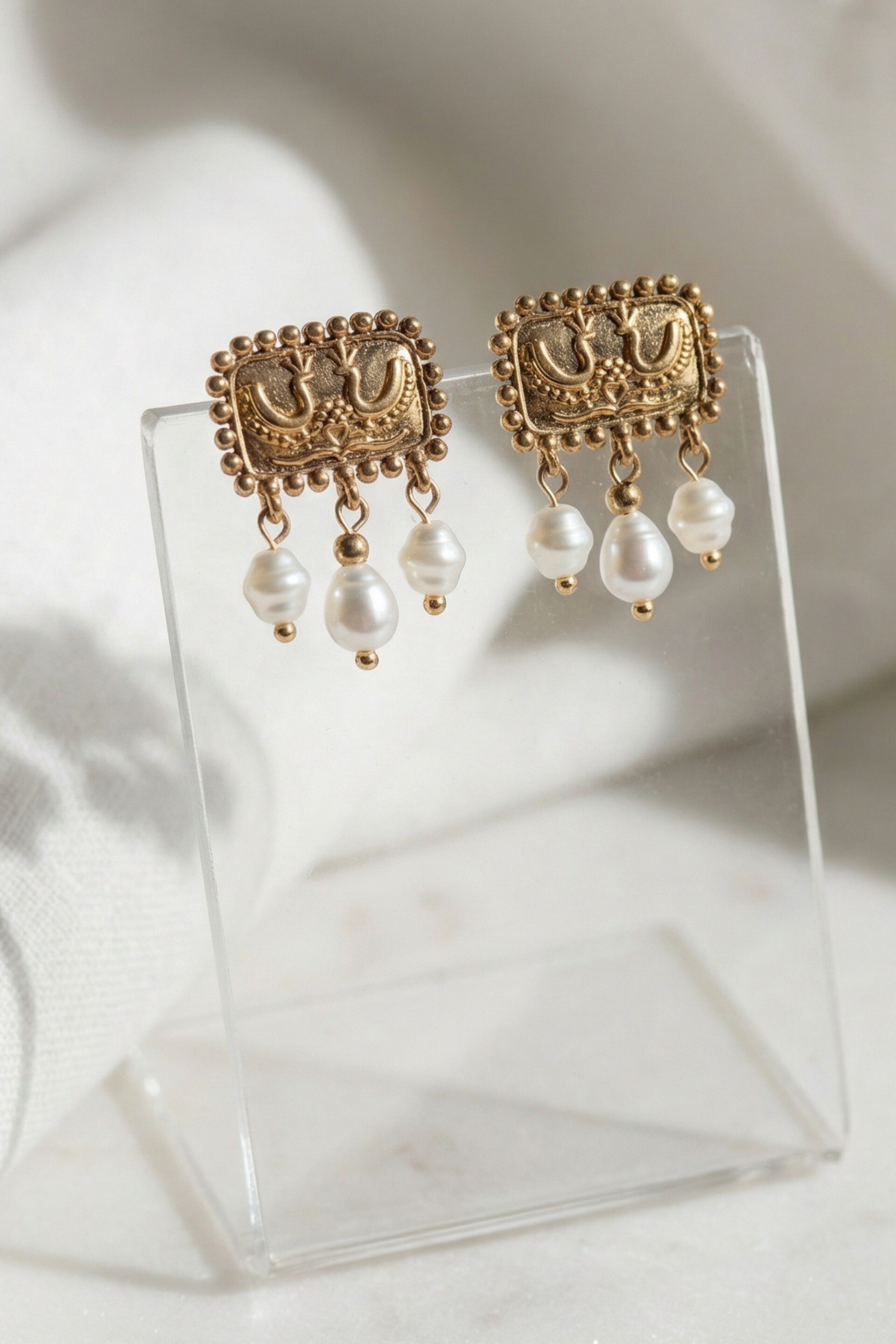 Gold-tone brass earrings featuring a peacock motif panel with pearl bead drop accents.
