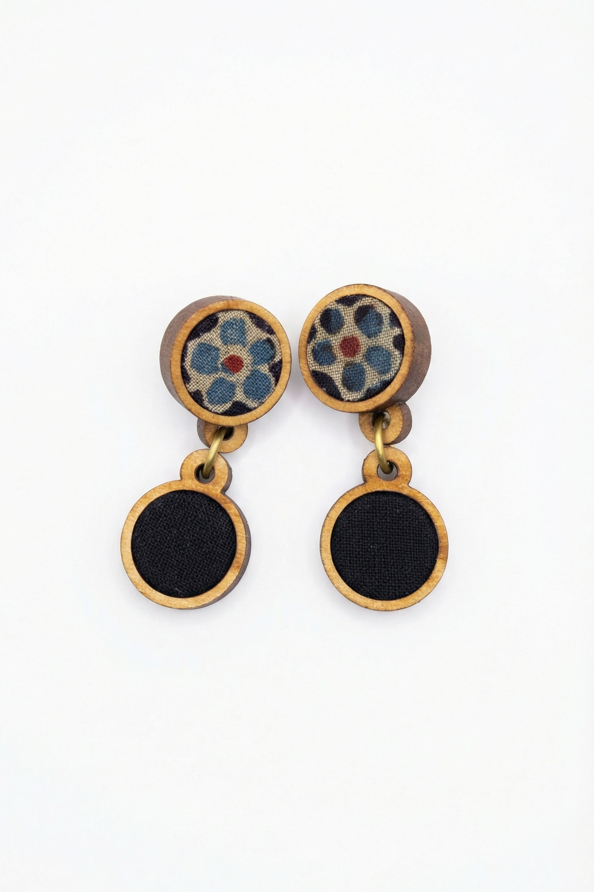 Multi-coloured dangler earrings designed with a wood frame, fabric detailing, and brass accents in a circular silhouette.