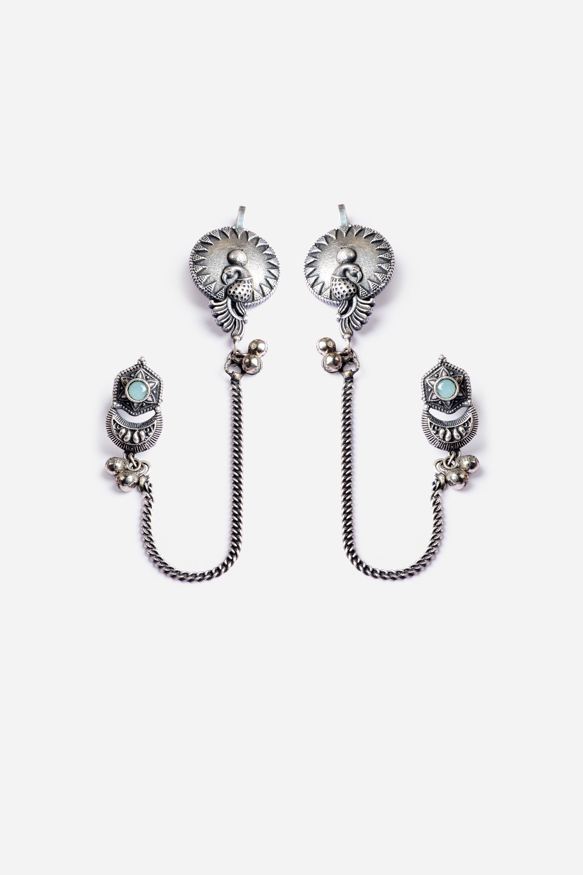 Bring a hint of melody to festive dressing with the Silver Song Ear Cuffs. Designed in oxidised brass with glassy details, these sleek cuffs hug your ears with understated glamour. Ideal for styling with flowing skirts or fusion separates.