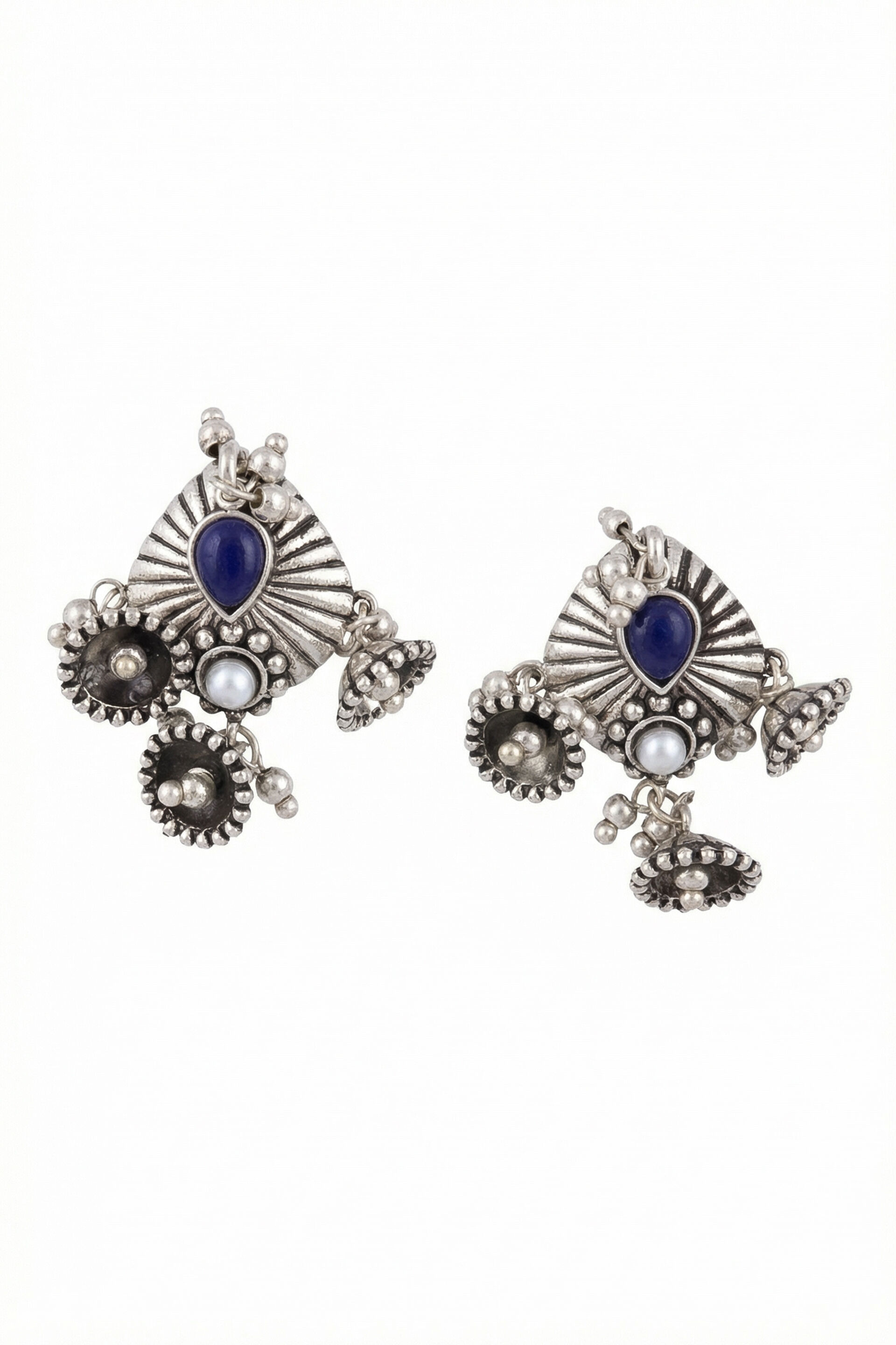 Antique silver-tone brass dangler earrings featuring a blue stone detailing and bell drop accents.