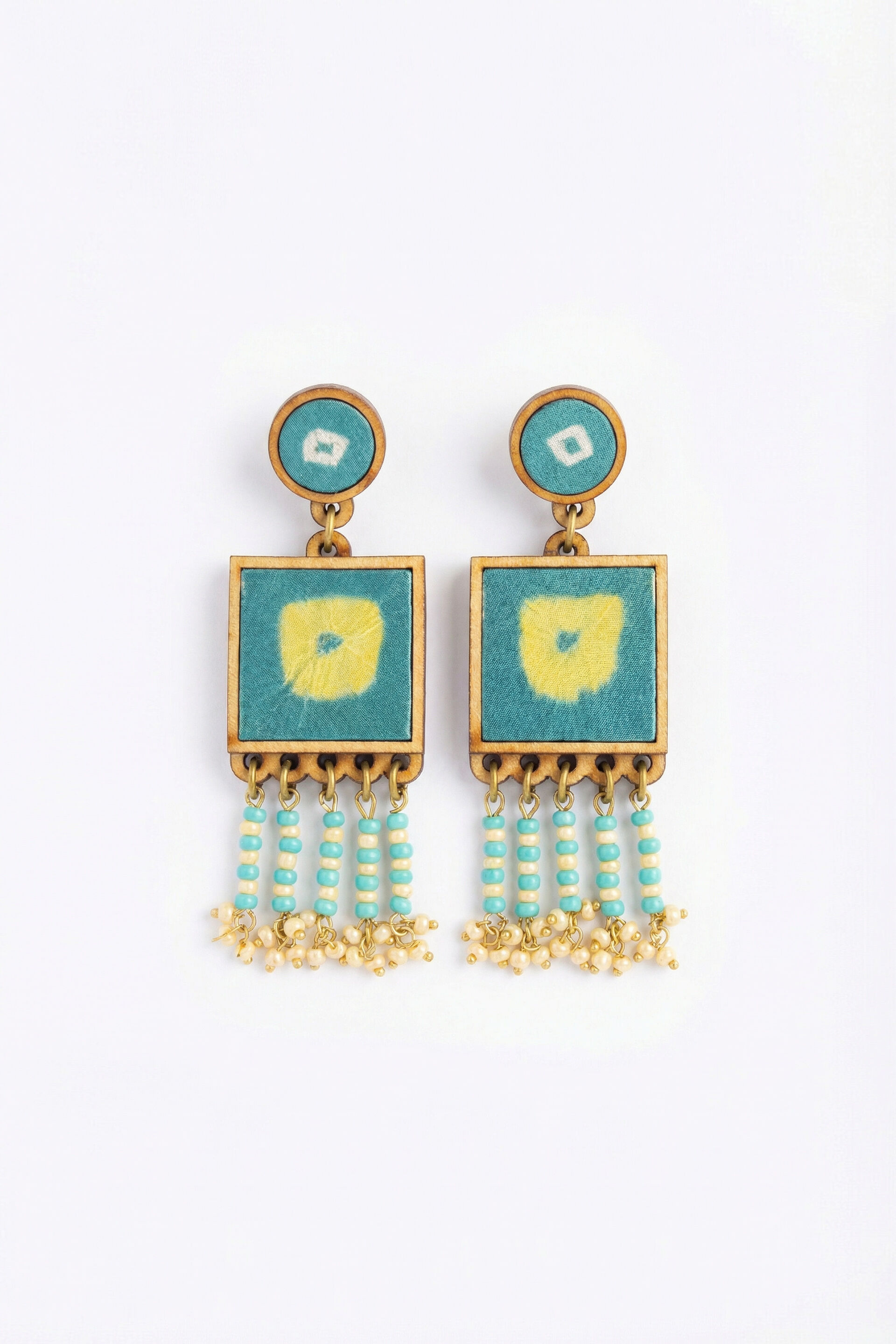 Multi-coloured dangler earrings featuring a wood frame with fabric, brass accents, and glass bead tassel detailing.