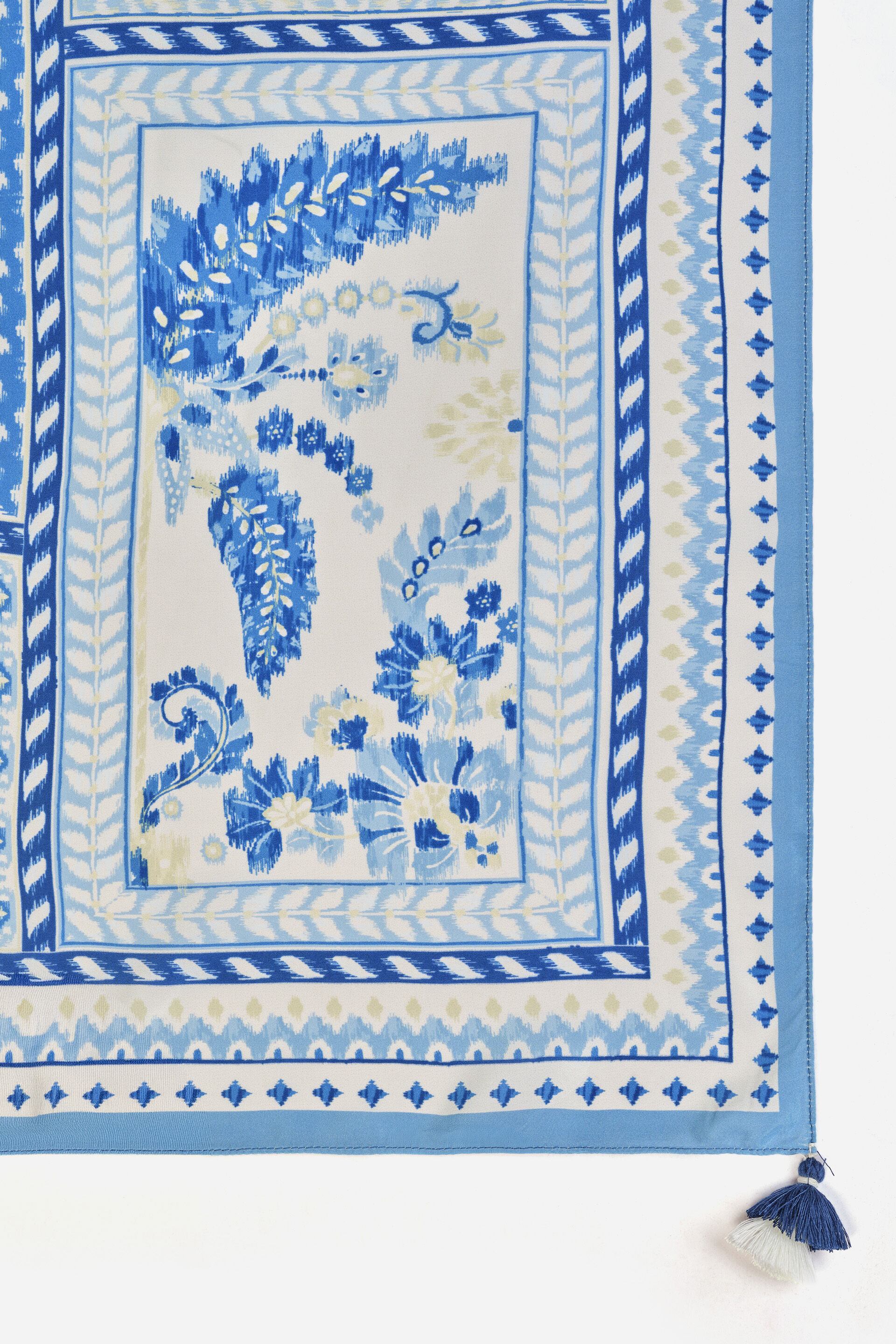 Crepe scarf featuring a blend of white and soft powder blue tones, brought together through a detailed print that combines floral, bird and abstract motifs, with tiger elements placed at the centre. The interplay of colours creates a balanced, nature-inspired palette. Finished with blue and white tassels with bead detailing at all corners.