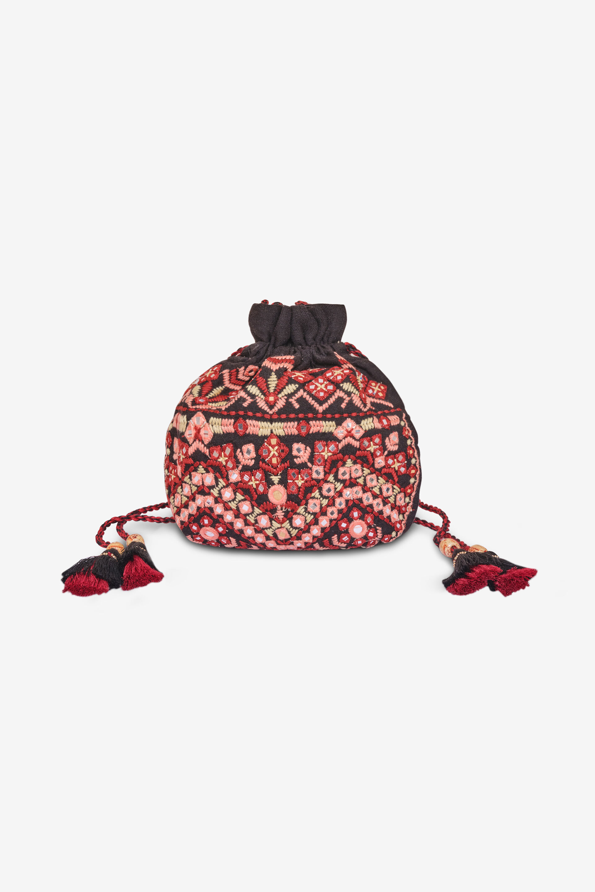 Bag the spotlight with this black velvet beauty! With vibrant red and beige mirror detailing inspired by traditional Indian motif, easy-to-hold handles, and a tassel closure, it’s the perfect pick for any festive look.