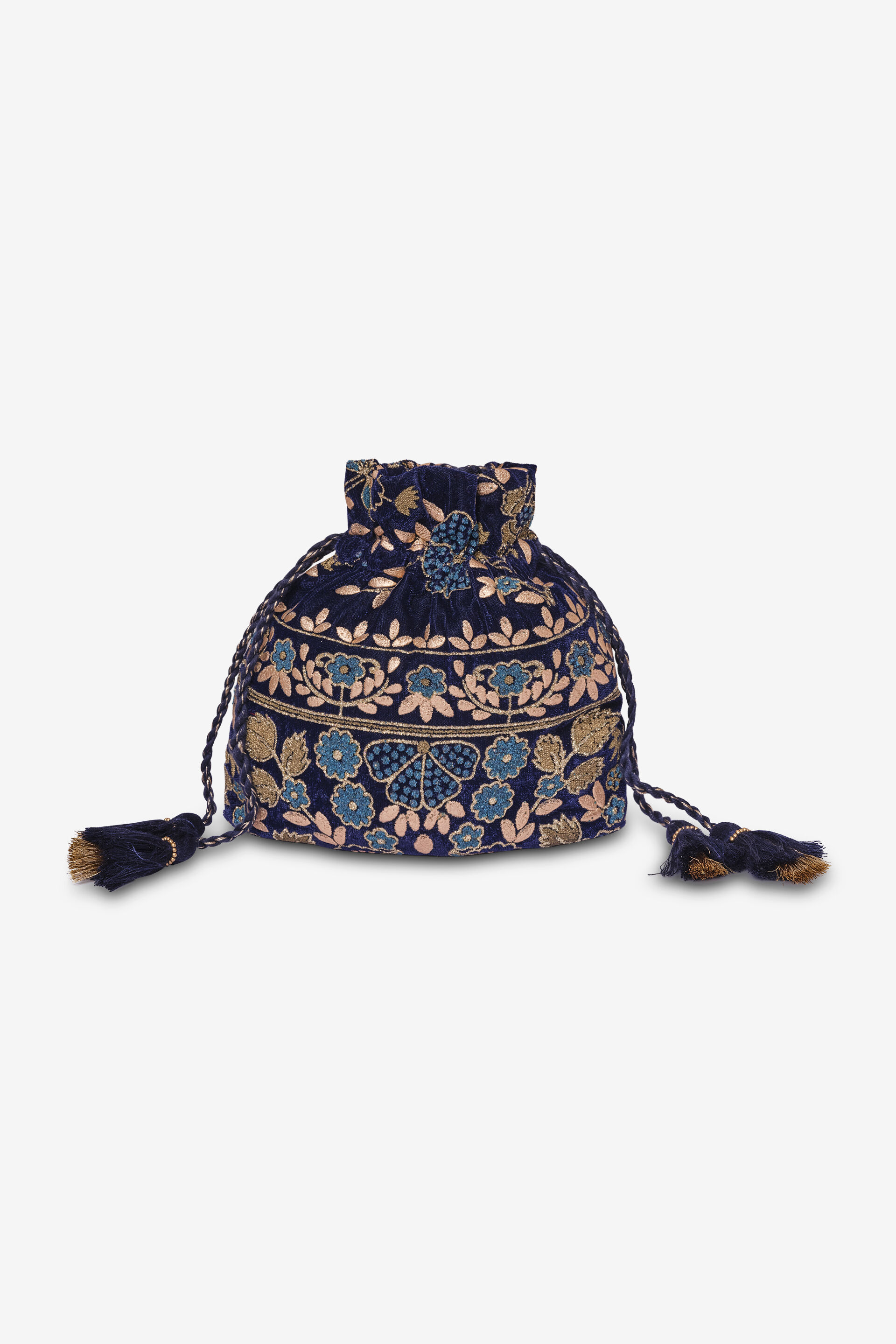 Carry the charm wherever you go! Our blue velvet potli features a floral-inspired shimmer motif. With sleek handles and a tassel closure, this bag is all about effortless elegance.