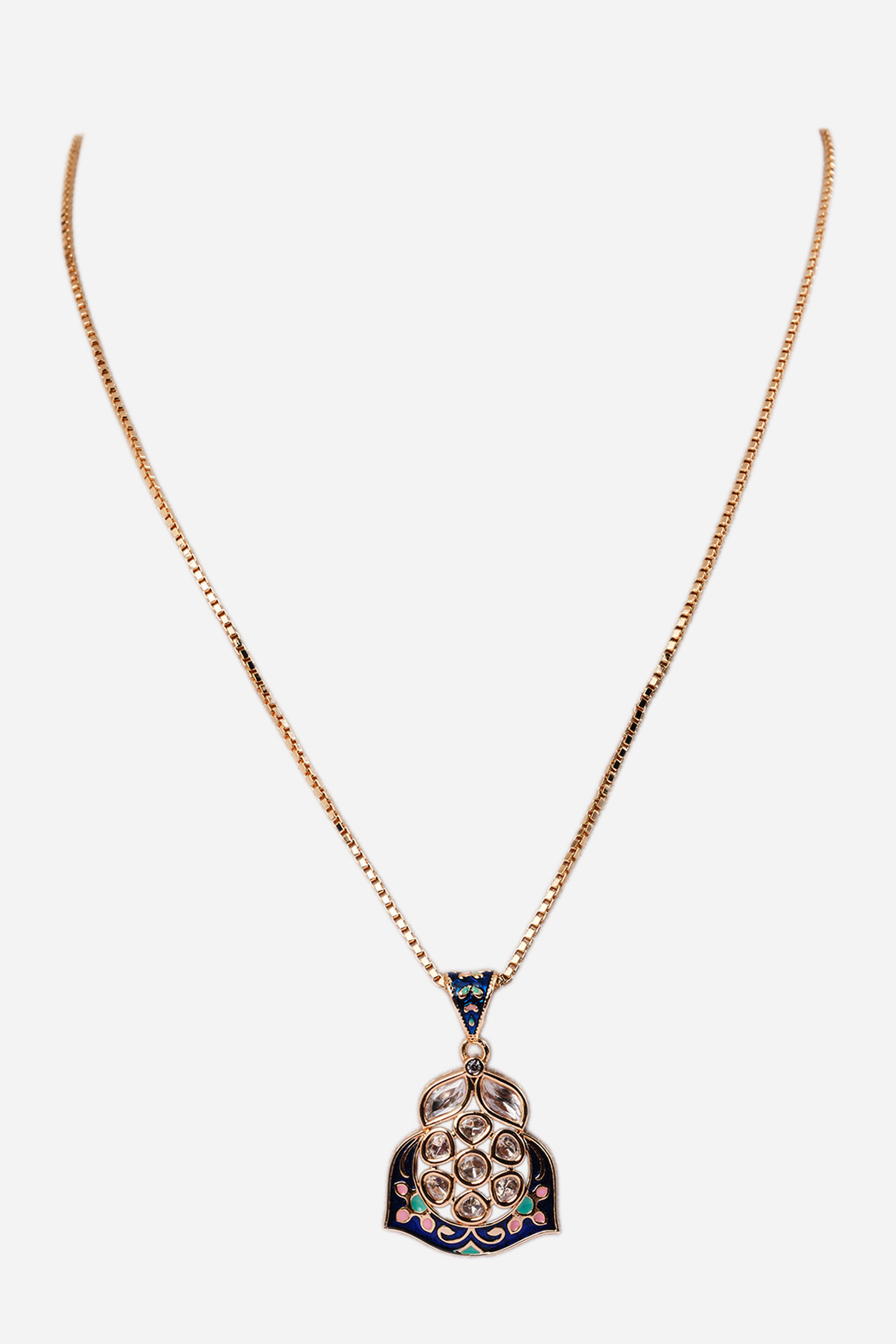 Delicate yet striking, the Afsaana Necklace is crafted with a golden finish and features intricate enamel and kundan detailing. Designed in a pendant style with a secure hook closure, it brings a timeless elegance.
