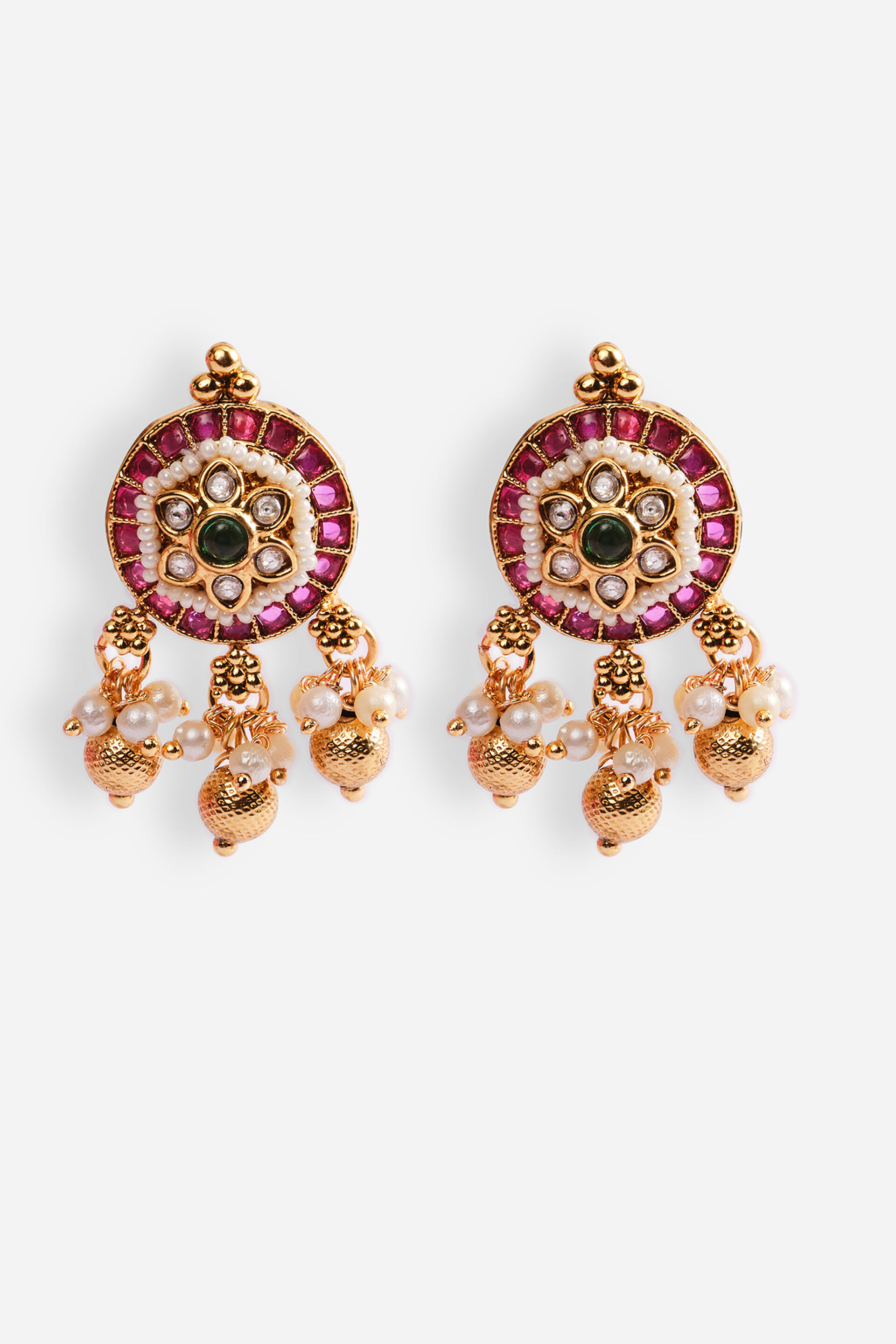 Radiant and festive, these golden drop earrings showcase multicolour detailing with luminous pearl drops. Finished with a secure stopper closure, they bring a vibrant elegance to any celebratory look.