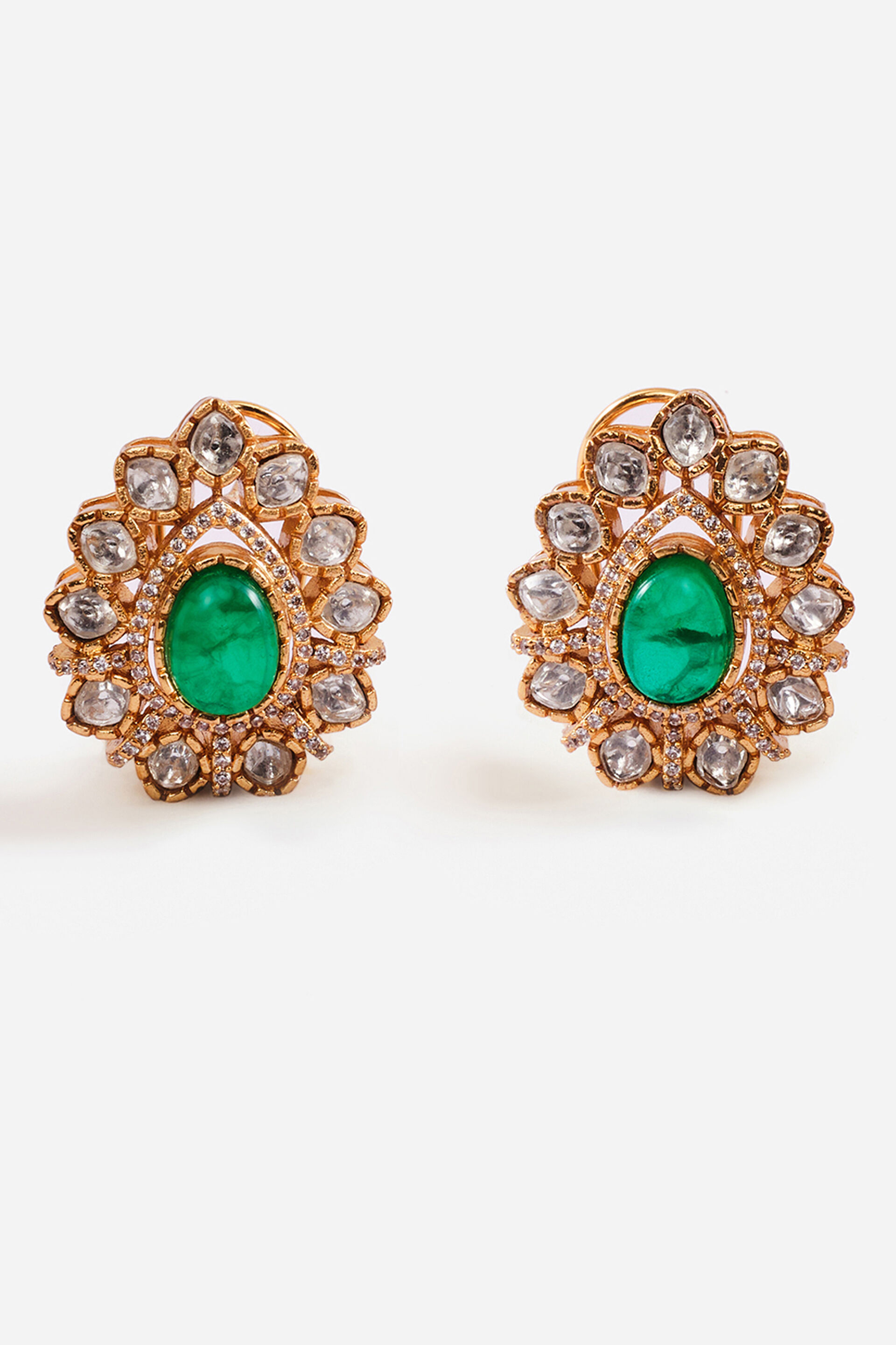 Crafted in a golden finish with dual fastening for comfort, the Rumaan Earrings dazzle with brilliant moissanites and lush green accents. A piece that radiates old-world charm while styling seamlessly with contemporary looks.