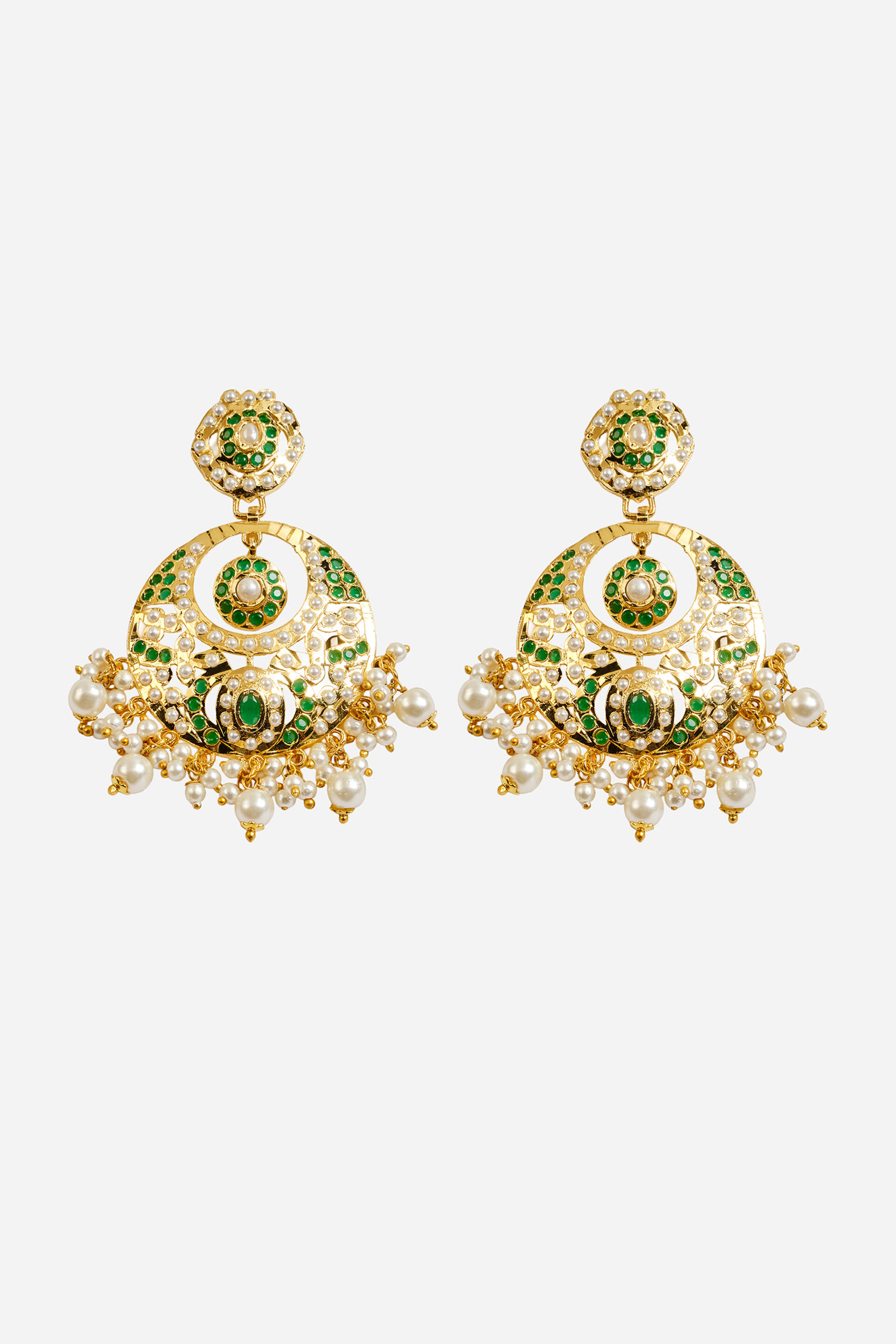 Turn heads in our Green Moti Mahal Chandelier Earrings, where bold hues meet intricate brass craftsmanship. Finished with a secure back-stopper closure, these earrings add festive drama to sarees, shararas, and evening gowns alike.