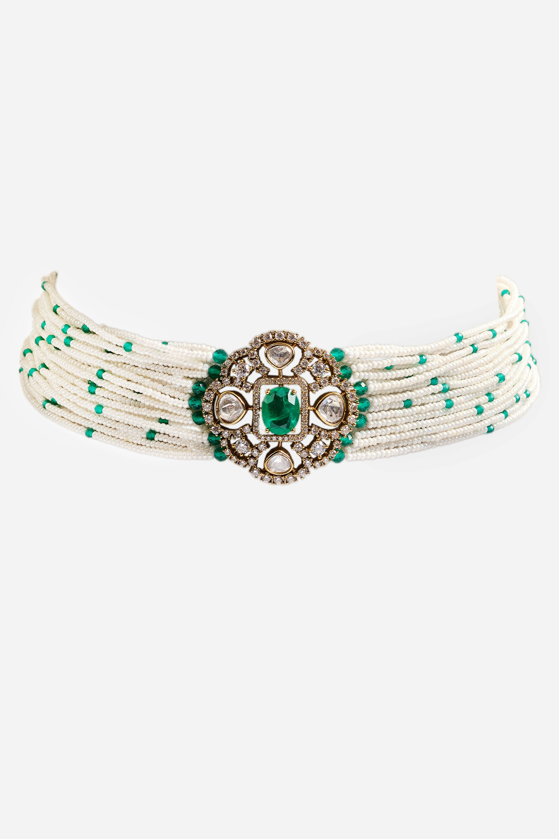 Festive elegance finds its muse in our Hara Noor Choker. Crafted in brass with kundan and CZ accents, the dori closure ensures a perfect fit. Ideal for styling with silk sarees, lehengas, or Indo-western drapes.