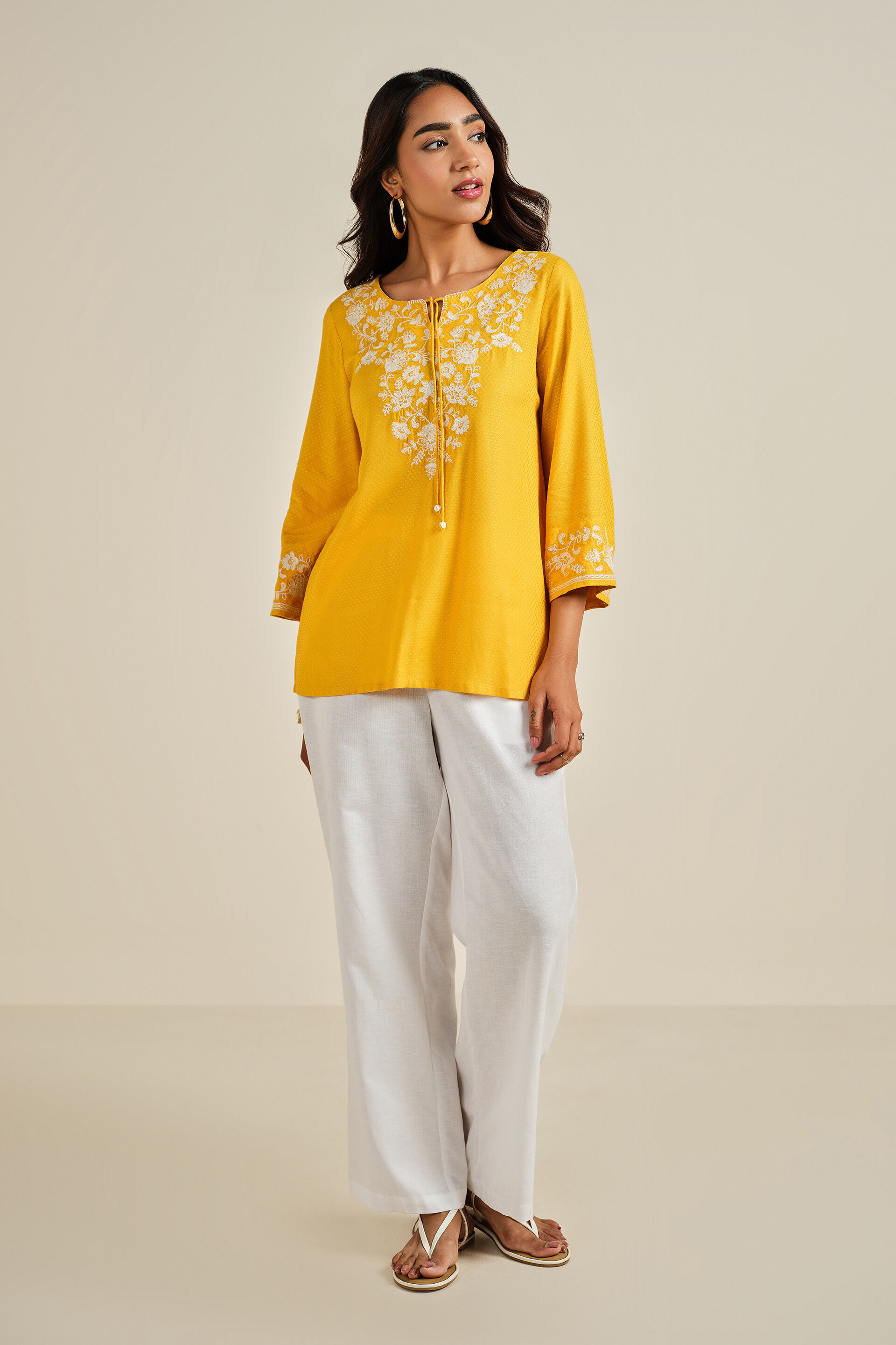 Featuring intricate white embroidery, this mustard-hued top comes in a relaxed fit. Pair it with white pants or a flowy skirt for an effortless look.