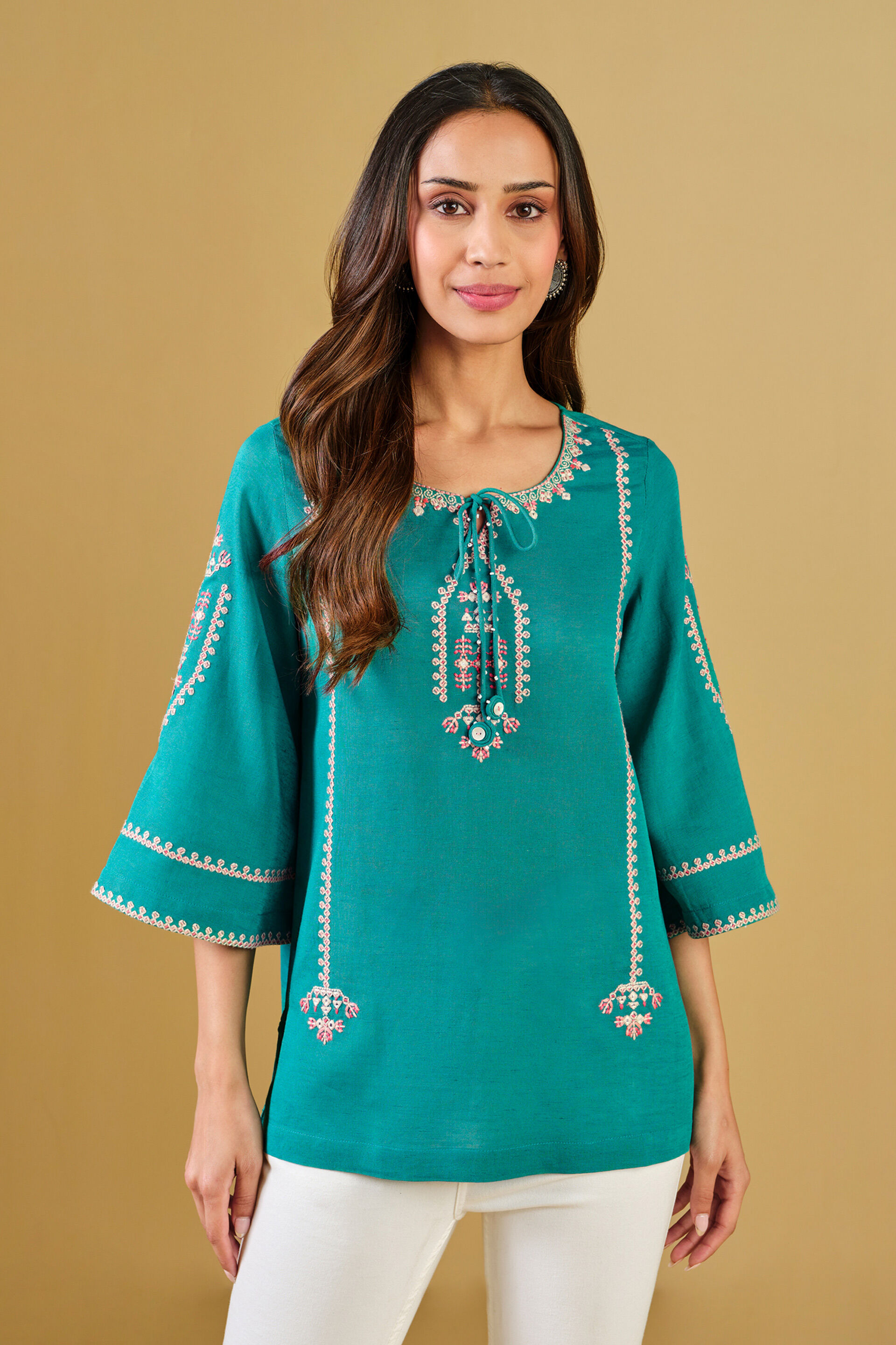 Summer’s all about keeping it light and breezy, just like this top! Crafted using a viscose-linen blend, this top features thread and mirrorwork embroidery and is a perfect pick for a summer day.