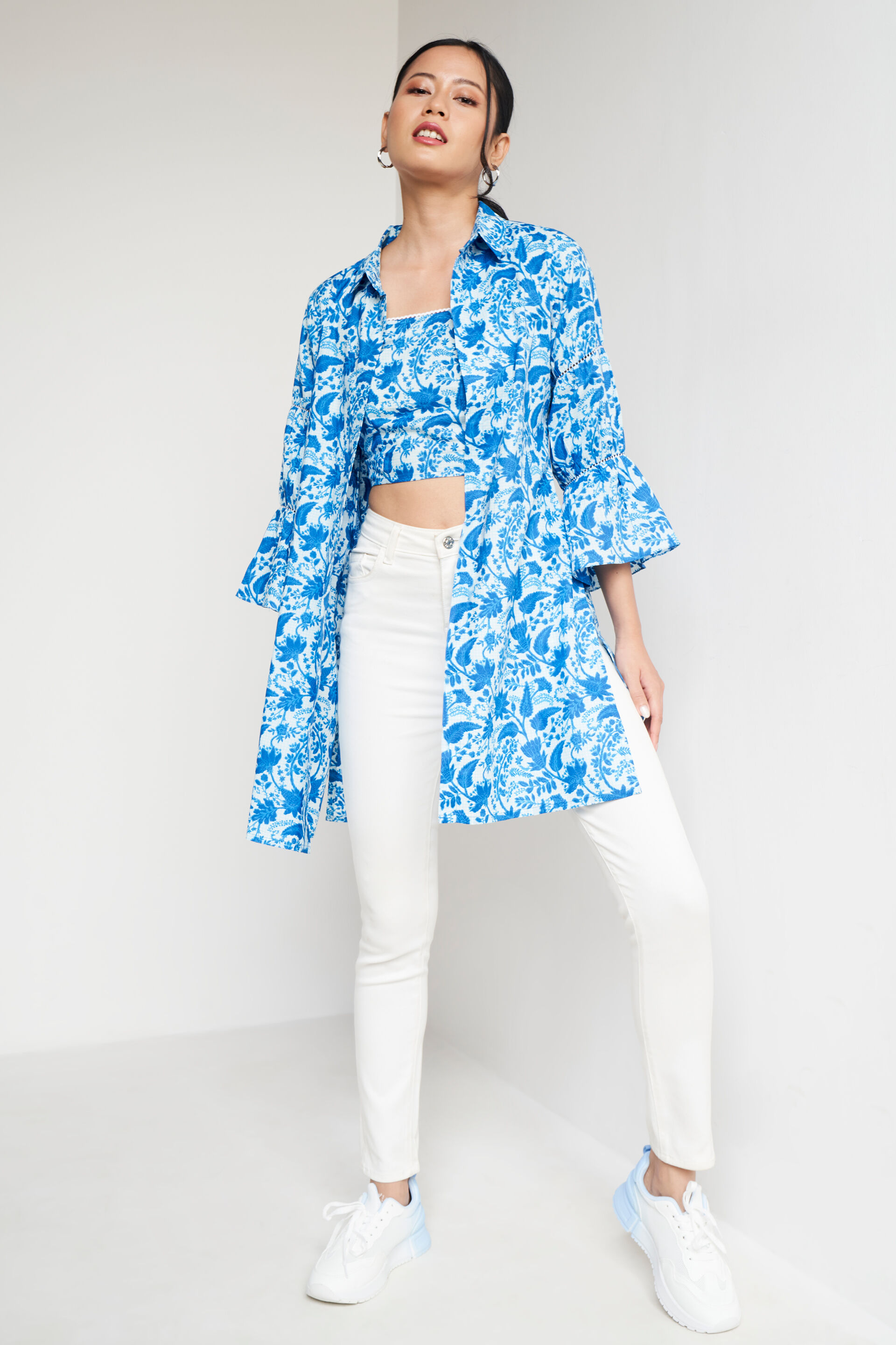 Elevate your casual look with this stylish shirt-style set from Global Desi. Featuring an India-inspired floral design, this cotton set includes a crop top with spaghetti straps and an overlay jacket with three-quarter flute sleeves. Pair it with contrasting trousers and tan flats for a chic and effortless ensemble.