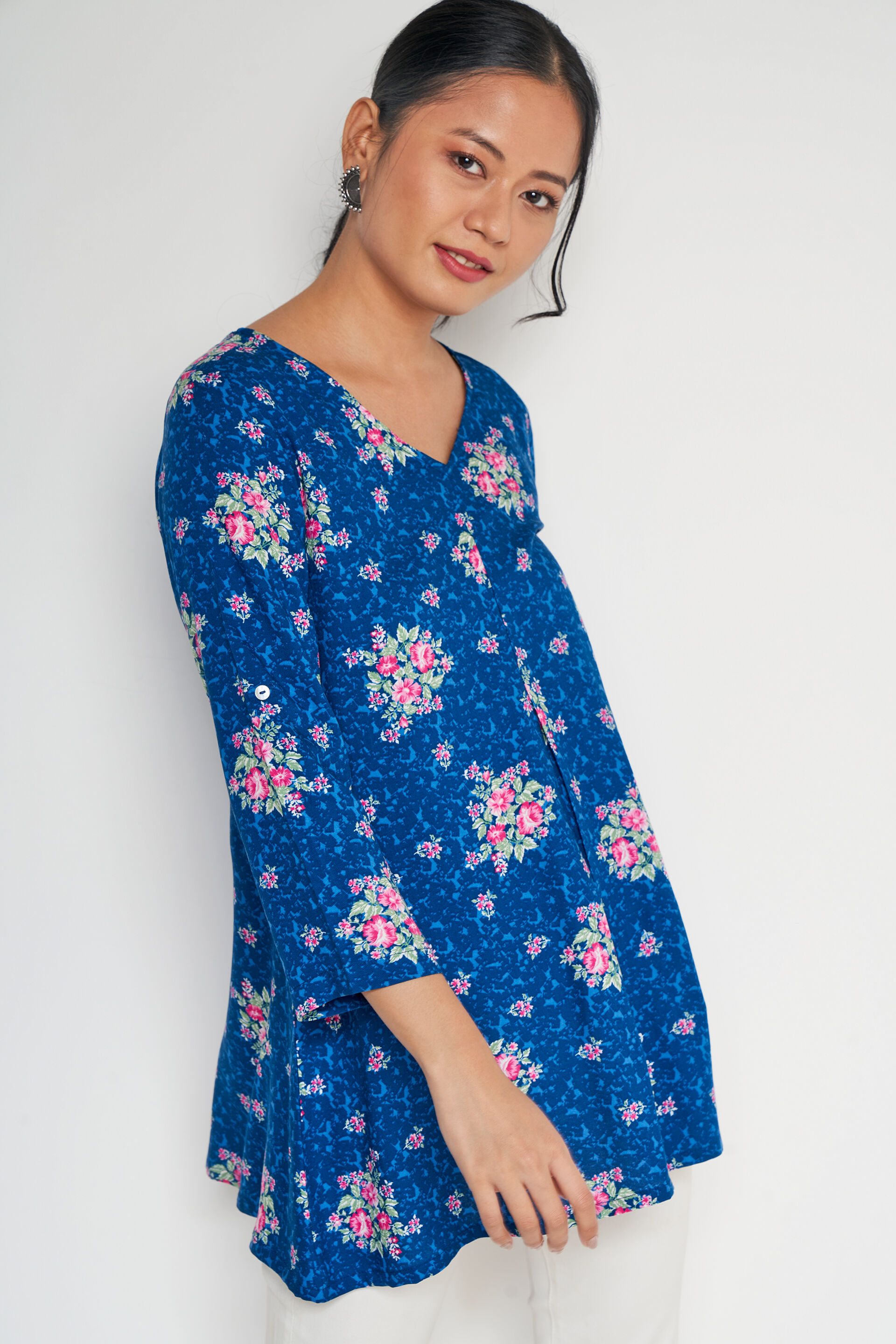 Exuding absolute feminine vibes with this minimal and elegant floral printed top for women from Global Desi. Crafted from light and breathable material, this top features three-fourth sleeves and a V-neckline in a straight-fit contour. Pair this casual top with a pair of white trousers, dainty earrings, studs, and flat footwear.