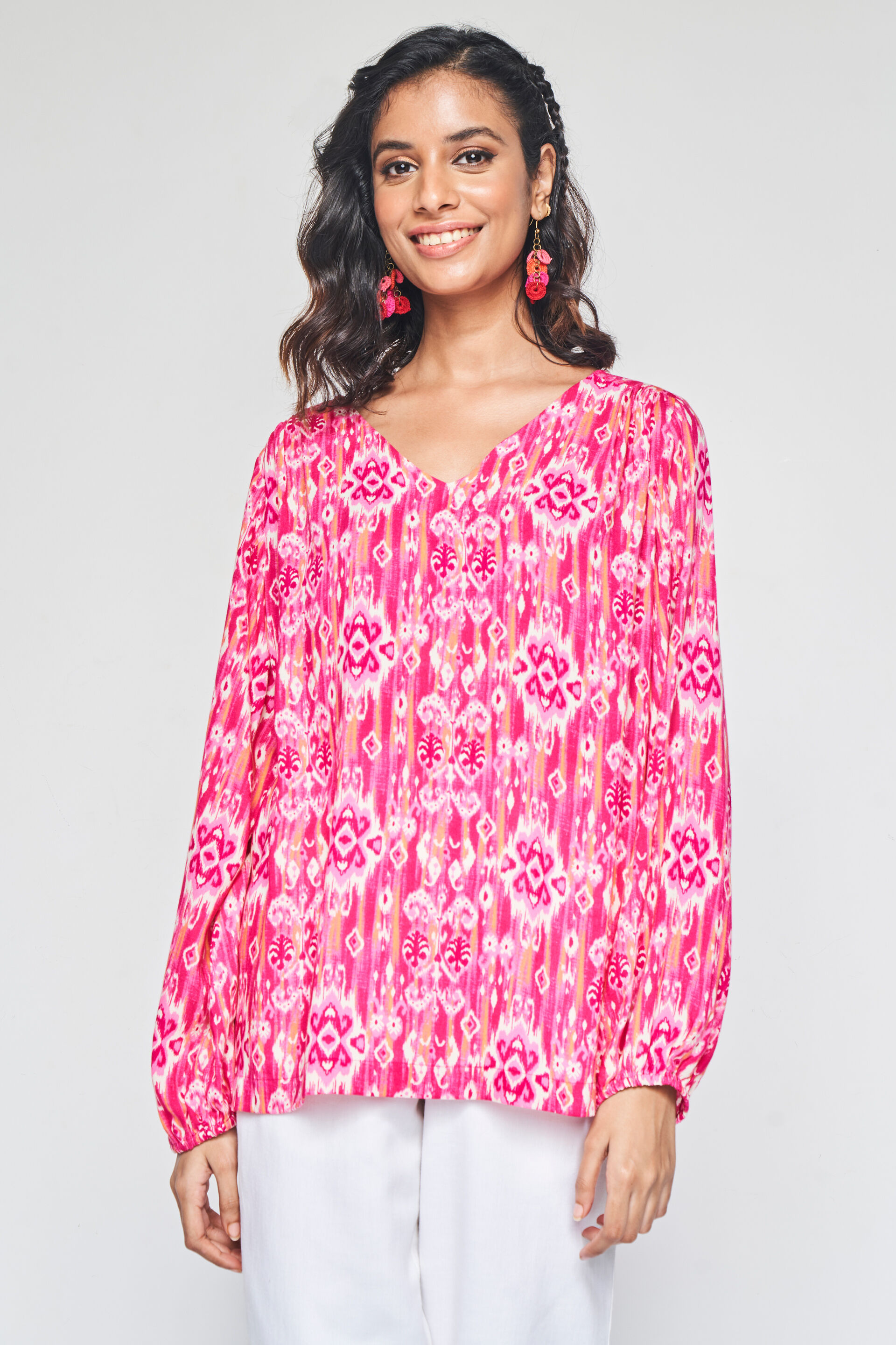Perfect for casual festivites, our Candyland top has a V-neck, puff sleeves and an abstract print all over.