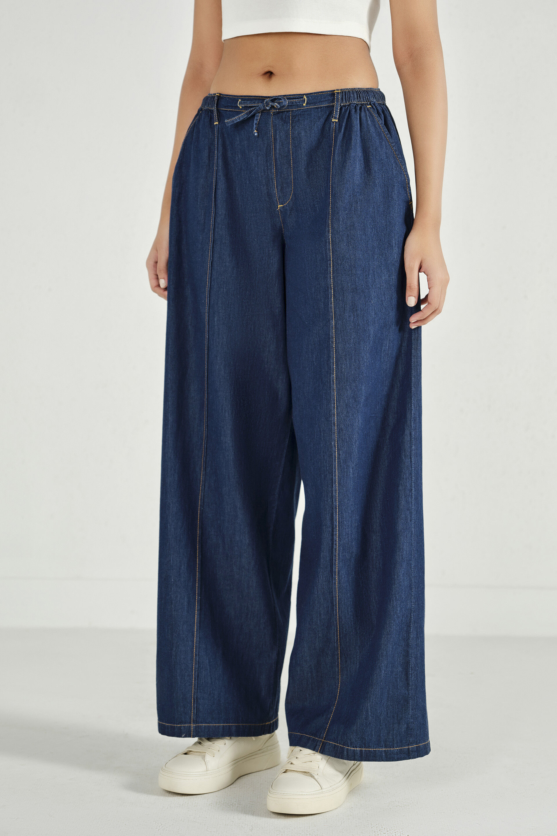 Straight cotton denim pants designed with front pintuck detailing, full-length silhouette, slip-in fit, and a front tie detail.