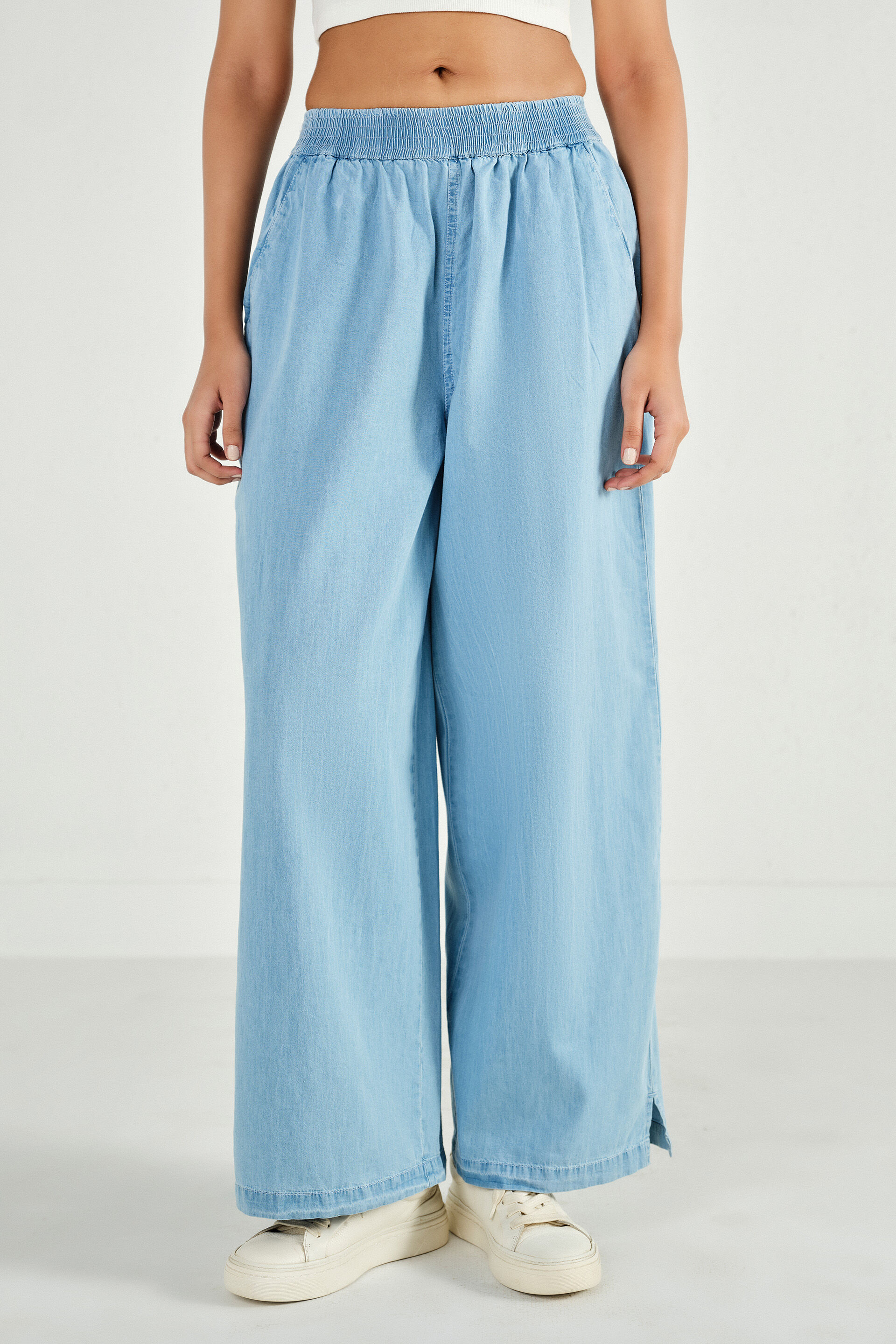 Cotton denim pull-on pants featuring an ice-blue shade, a straight full-length silhouette and two functional pockets.