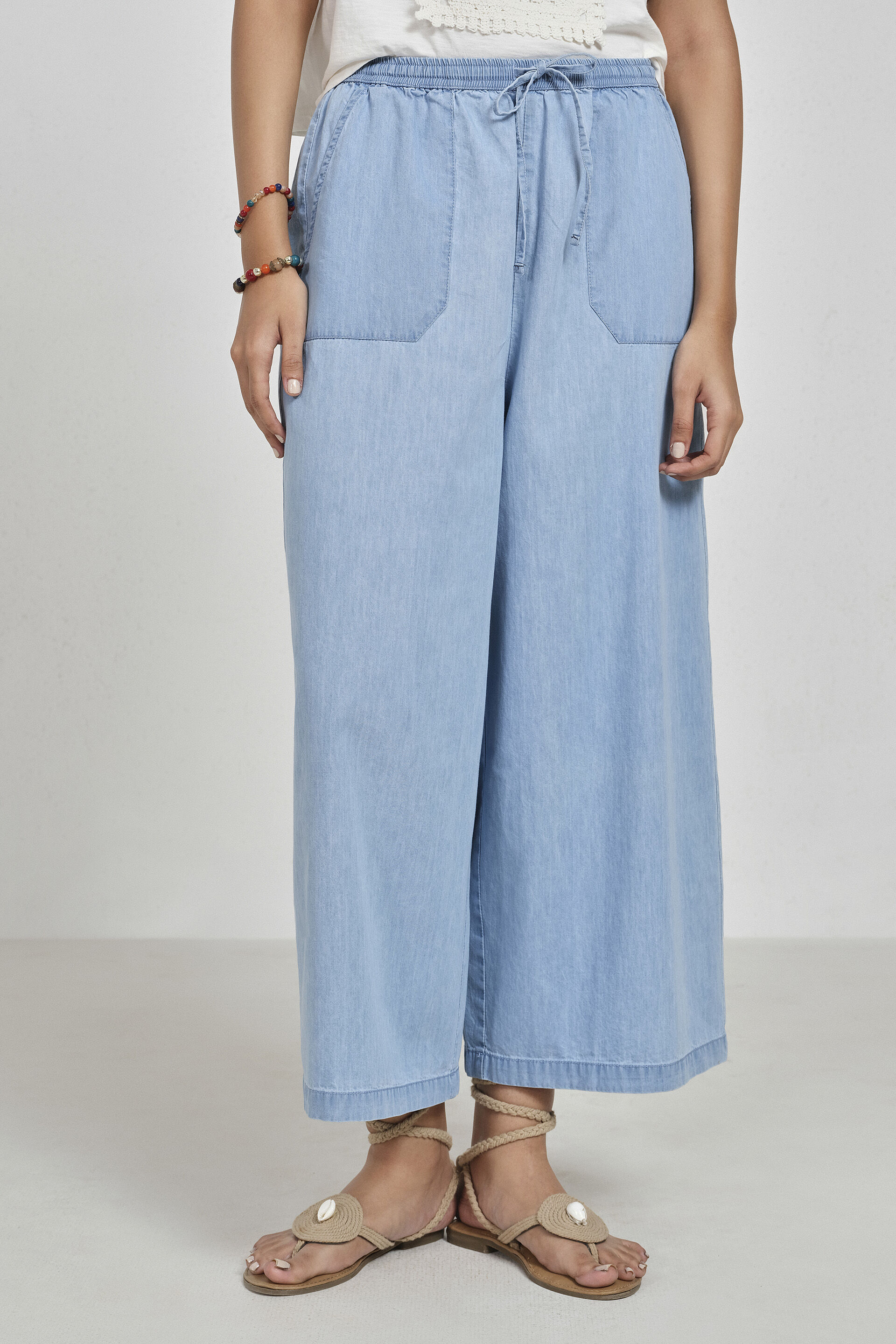 Ink blue mid-calf pull-on denim culottes featuring a straight wide silhouette and two functional pockets for everyday ease.