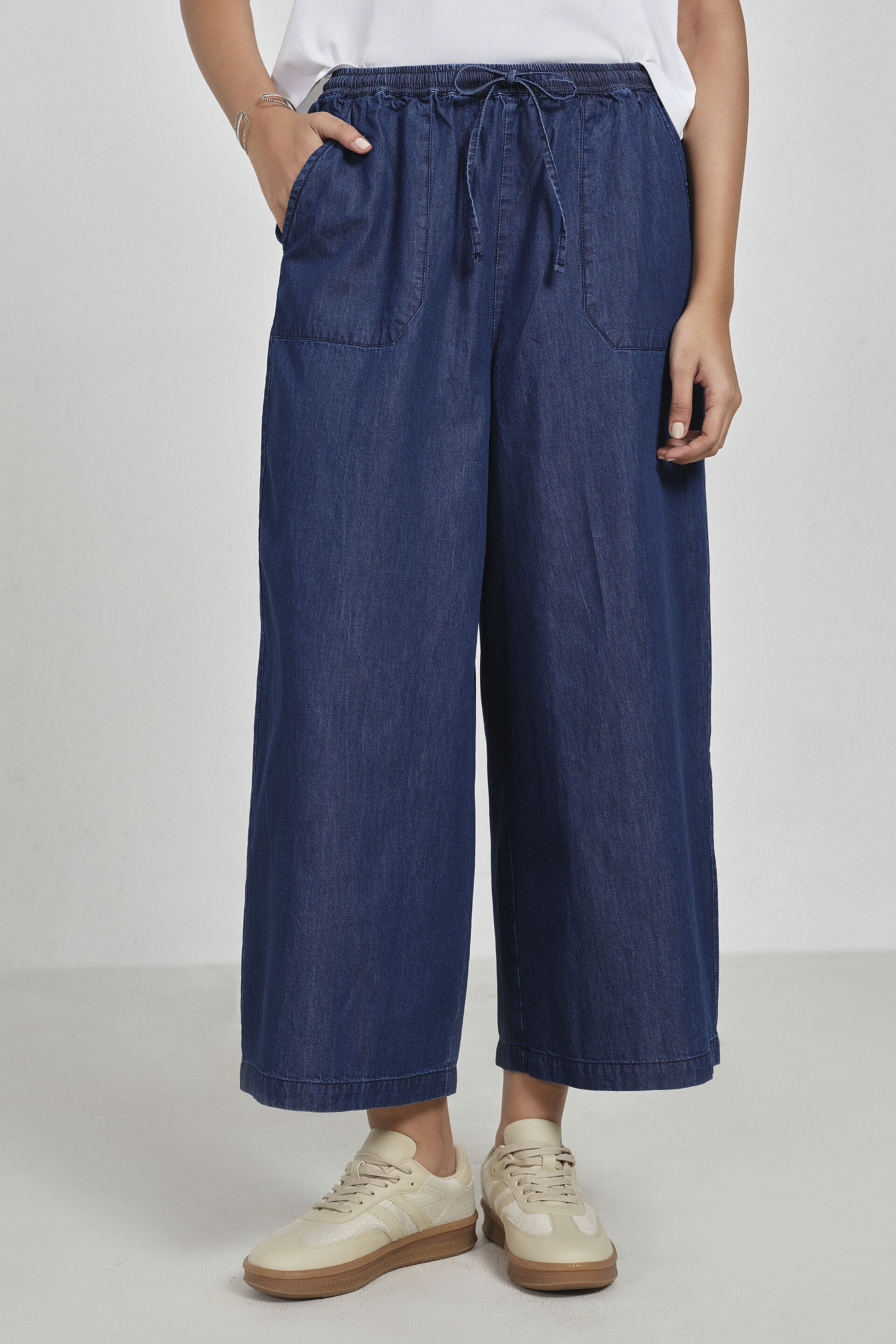 Ink blue mid-calf pull-on denim culottes featuring a straight wide silhouette and two functional pockets for everyday ease.