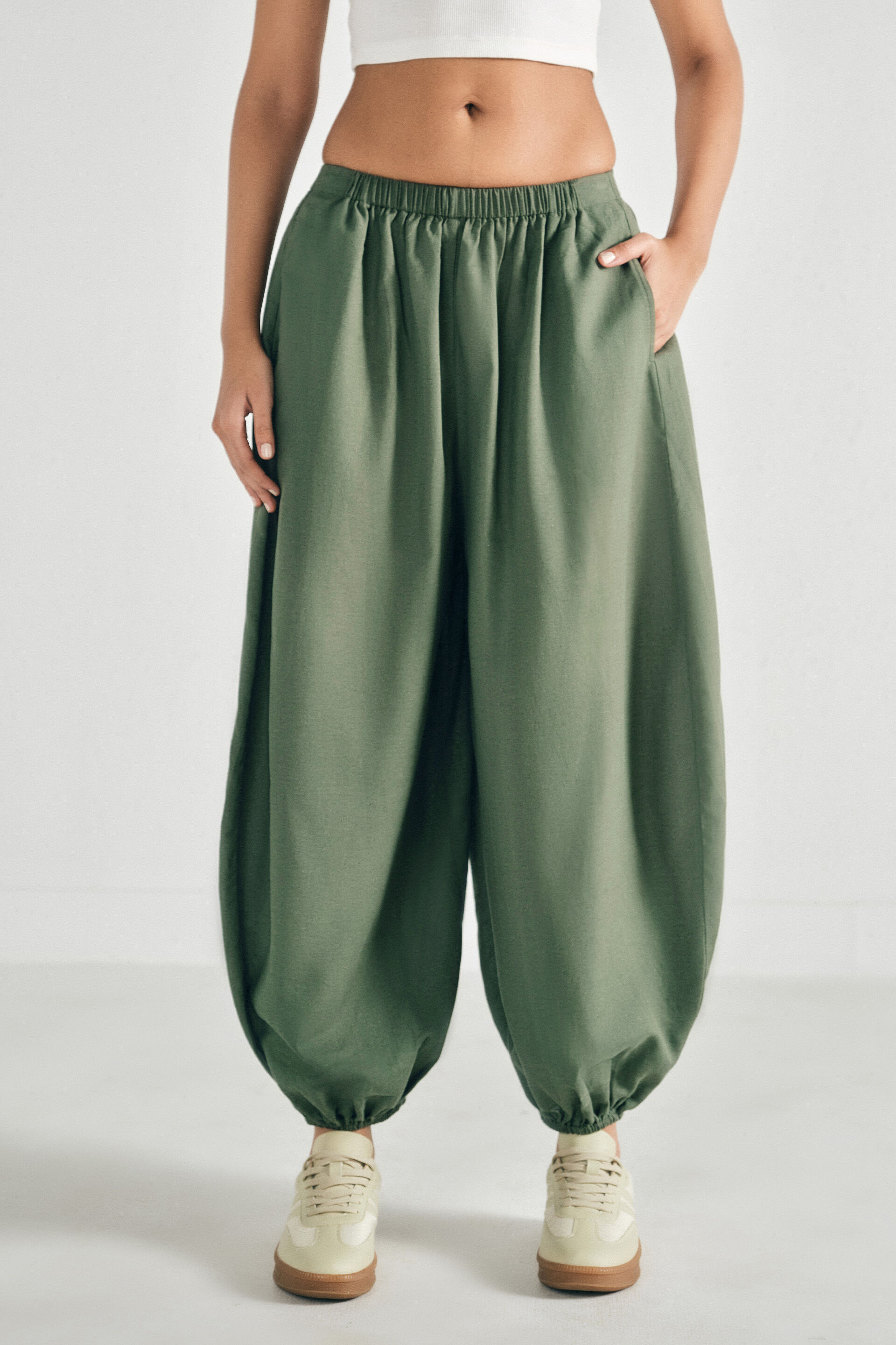 Military green balloon pants featuring a relaxed slip-in fit, two functional pockets, and a soft cotton-blend fabric for everyday comfort.