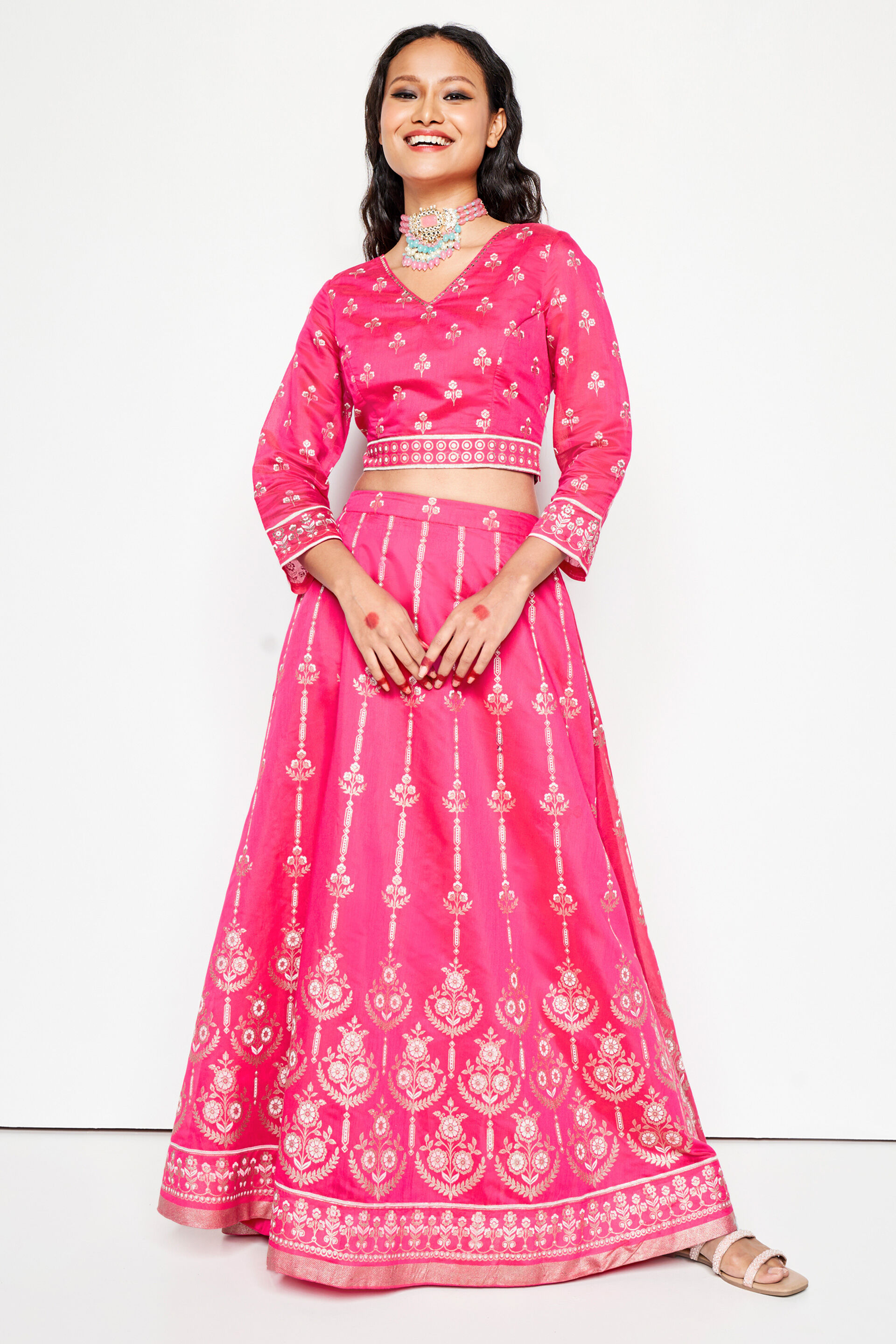 Designed in an eye-catching hue, our Rongmonch set features a bodycon top and a flared skirt that's light and twirl-friendly.
