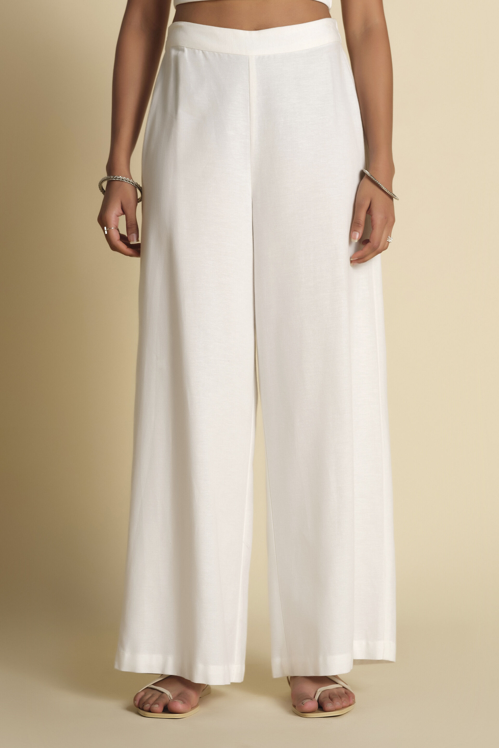 Crafted to keep you cool & comfortable, these white flared pants are made from a viscose linen blend fabric. Featuring a fit that offers ease of movement, these pants are lightweight and breathable, making them perfect for exploring the city or relaxed alfresco brunches. Pair them with a breezy shirt or tunic for an effortlessly chic look.