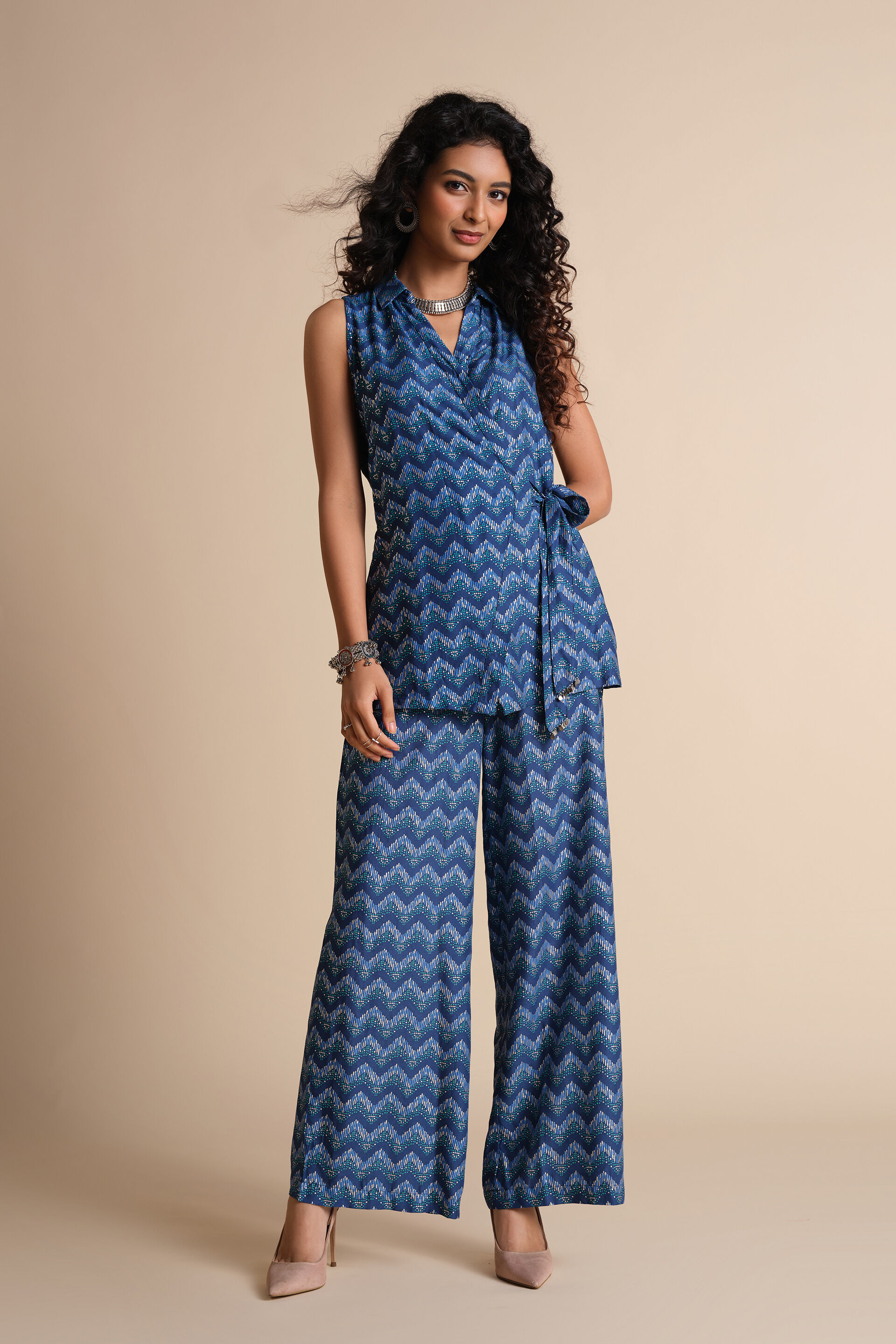 Crafted for fun outings with friends, this contemporary chevron set features a tie-up top & straight pants. Featuring a chevron print all over, this set is crafted in soft & breathable viscose. Style this ensemble with statement jhumkas or trailing shell jewellery to look chic.