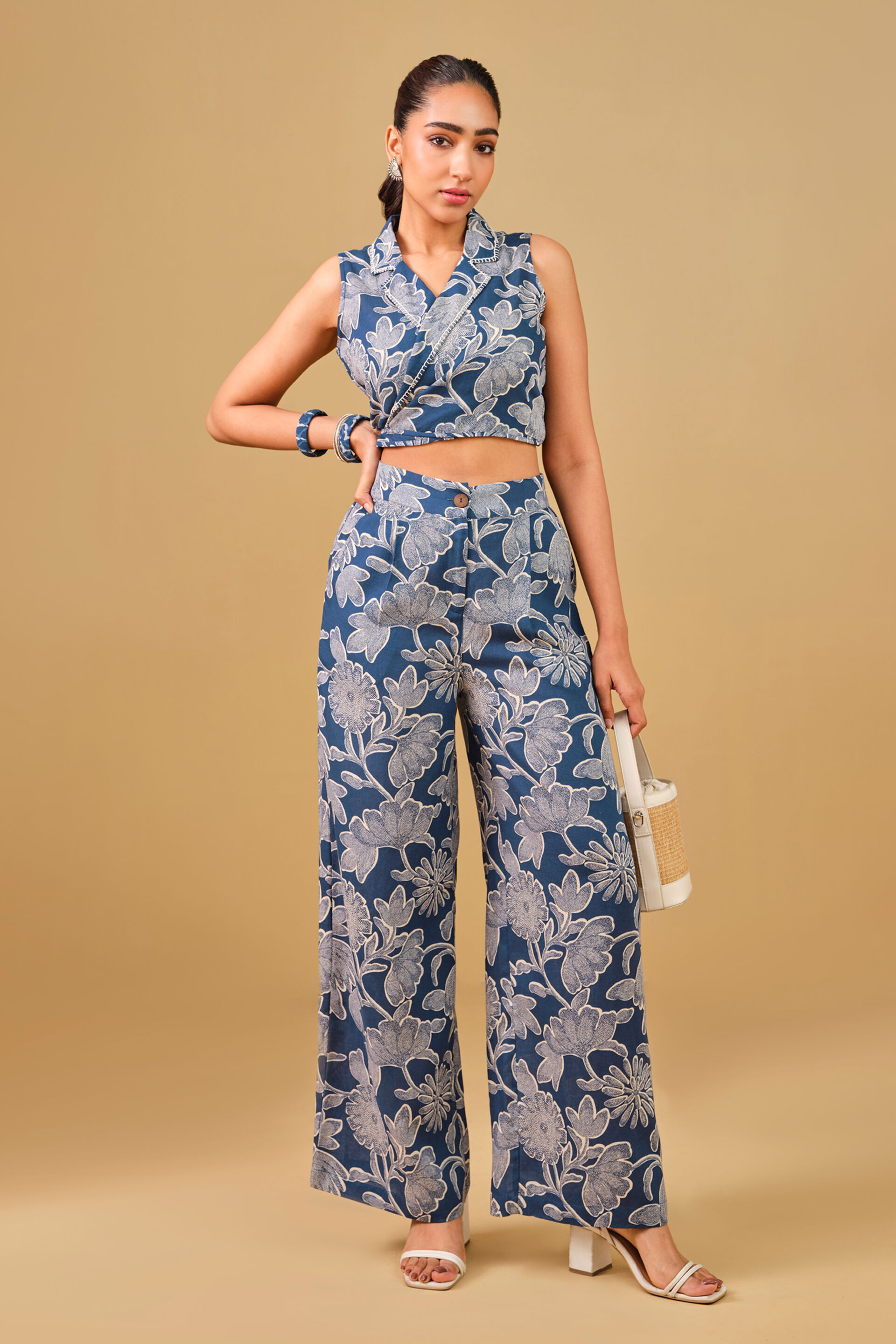 Embrace the blues this summer with this gorgeous floral printed co-ord. Featuring abstract floral print, an overlap crop top and wide leg pants, this 3-piece set is perfect when you want to channel your inner sunshine.