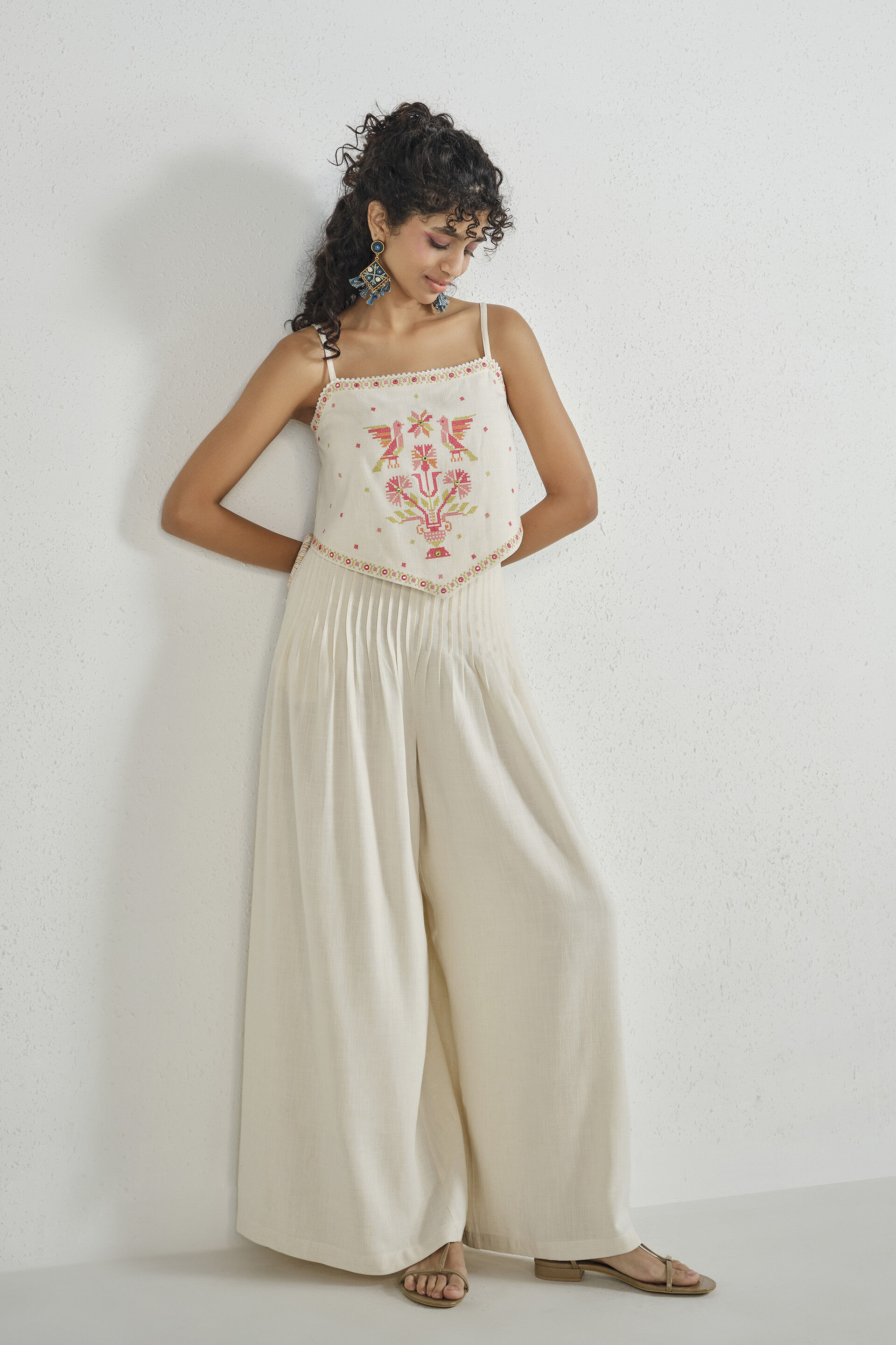 A two piece set in off-white that comes with an embroidered V-shaped handkerchief crop top featuring a square neckline and strappy silhouette, paired with pleated wide-leg slip-in pants detailed with two pockets.