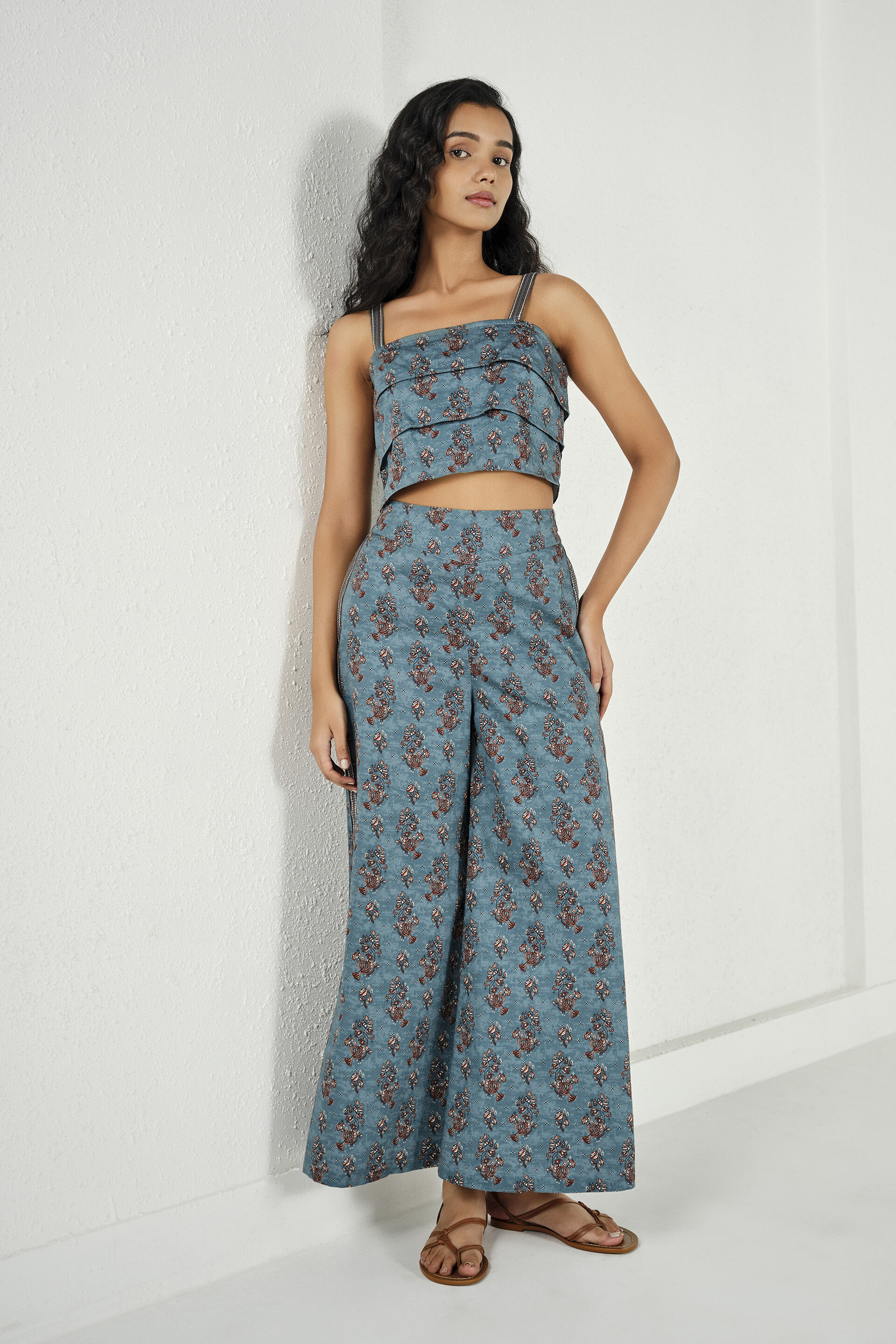 A two piece set in pure cotton that comes with a pleated strappy crop top featuring a square neckline and boxy silhouette, paired with straight full-length pants detailed with a front zip and two pockets.