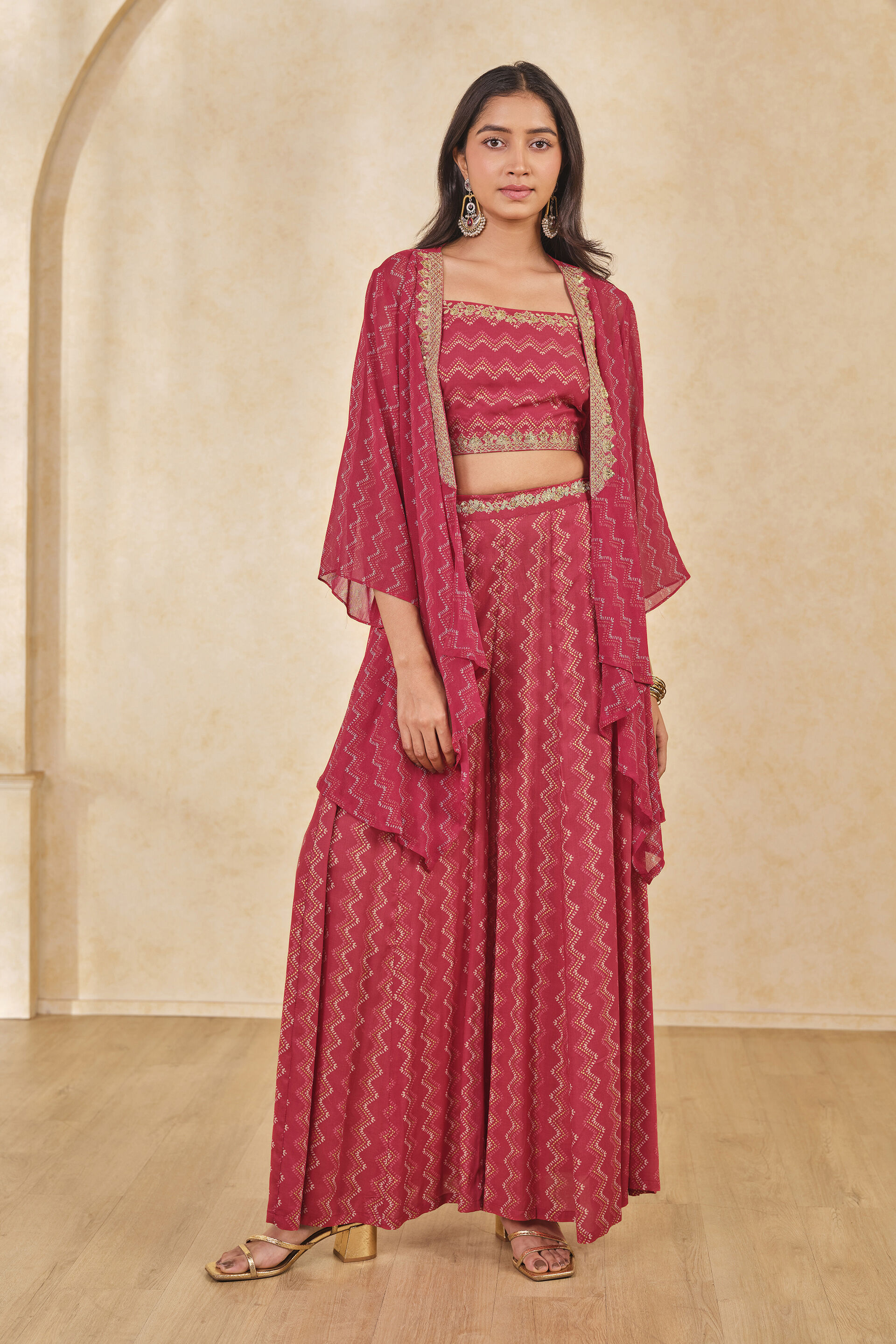 Celebrate in style with this 3-piece set, made from a lightweight & soft fabric for all-day comfort. Featuring a chevron print & comprising of an asymmetric shrug, spaghetti crop with straps & wide legged pants. Featuring intricate zari & mirror embroidery along the pants waist and shrug's borders, this set is the perfect outfit for any event.