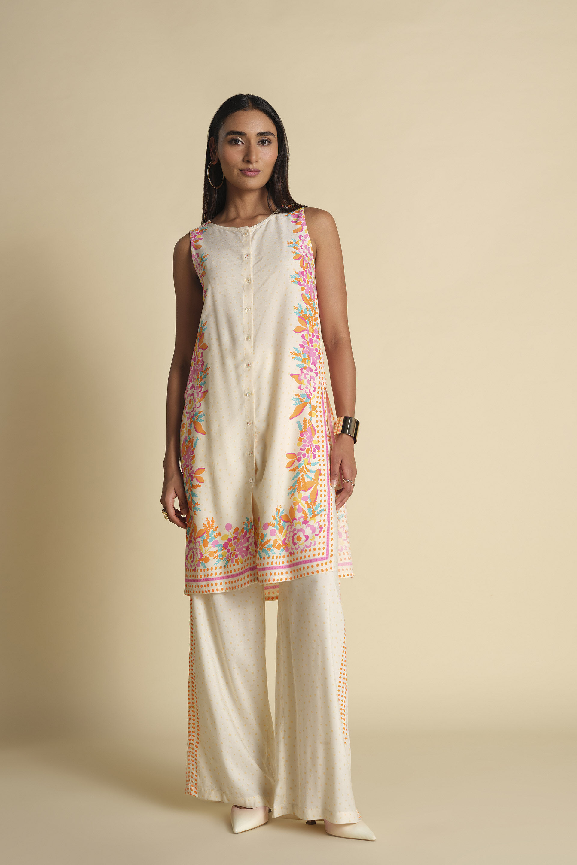 Breezy & inspired by flowers, this eclectic co-ord is perfect for your weekend plans, Featuring colourful floral prints on the tunic & pants, this set is crafted from soft & breathable viscose. The button-down silhouette of the tunic allows you to style it in a variety of ways making it a must-have co-ord in your closet.