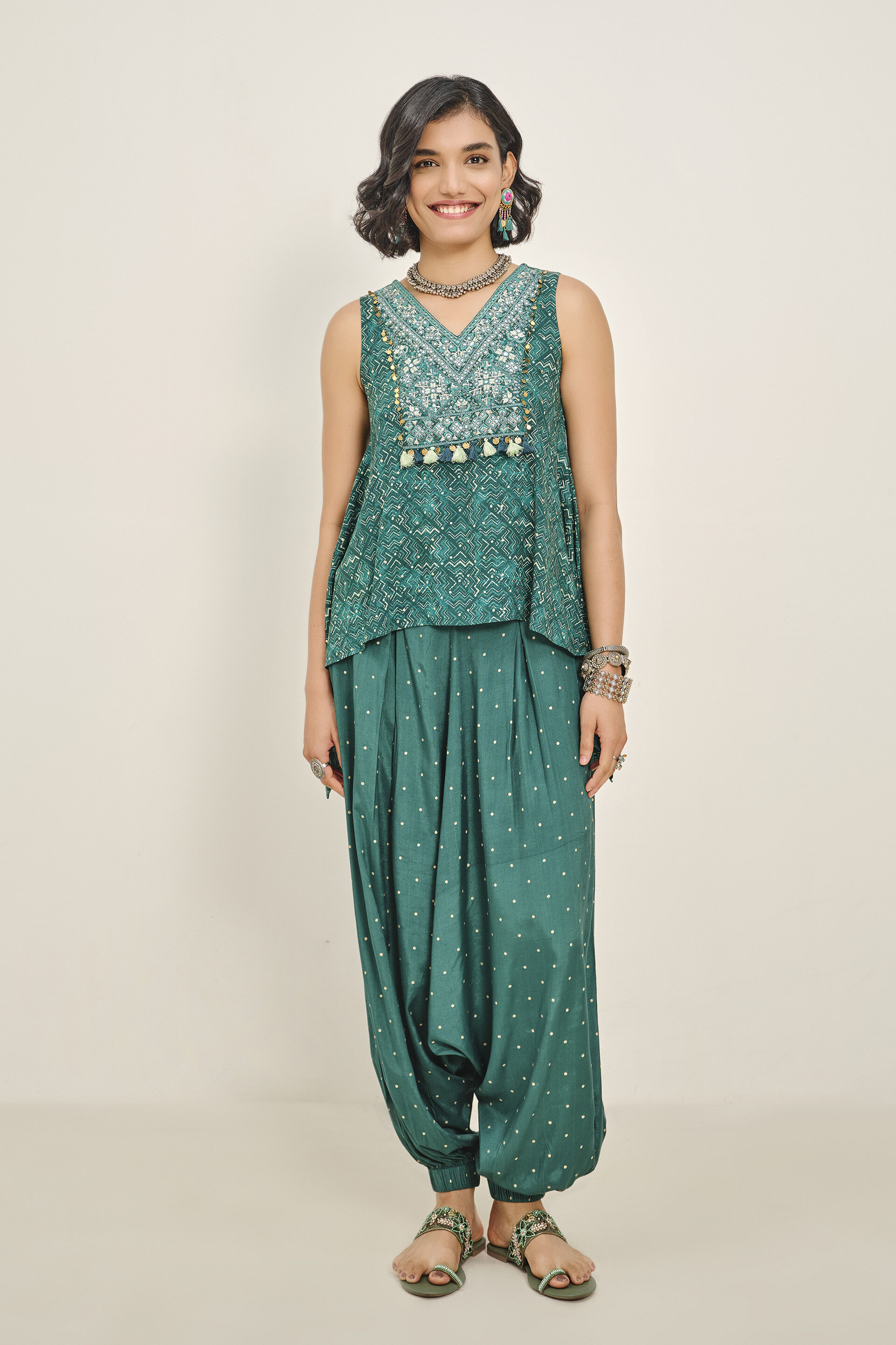 Fun, festive, and designed in modal - this set pairs a swingy V-neck top with embroidered detailing and fluid harem pants. With its playful fit and festive shine, it’s made for music nights and fun-filled celebrations.