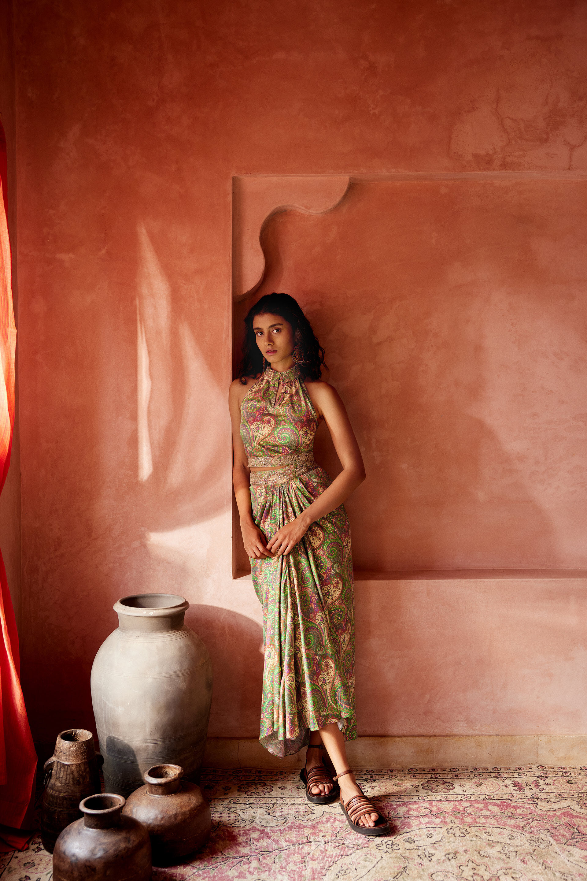 If you're a bridesmaid-to-be, this look is for you. This drape skirt set comes with a complementing halter-style crop top and features an ethnic print all over. Paired with statement accessories, it works well for both a vibrant sangeet ensemble and a modern wedding look. This set is crafted with a blend of viscose and cotton.