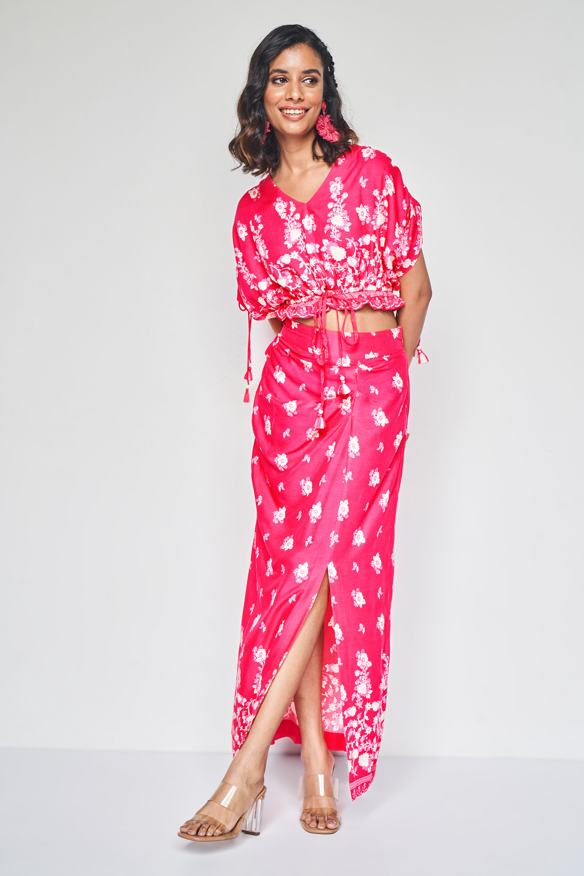 Crafted from a breathable fabric, this co-ord set has an all-over floral pattern. The cropped top has an elasticised waist with a tie-up detailing and the skirt features gathers at the front.