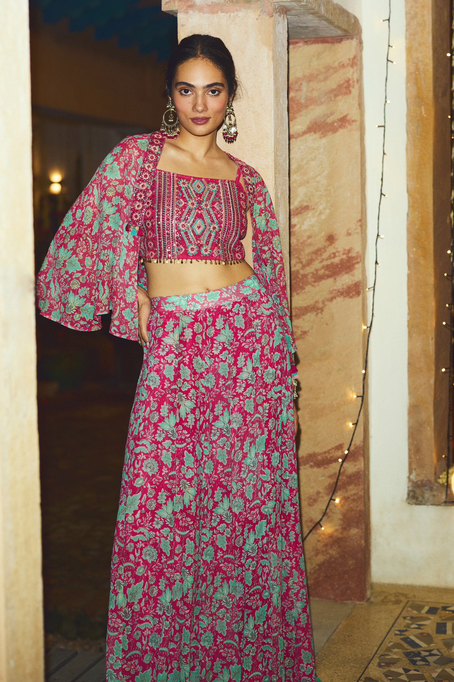 Perfect for the festivities, this pink set is covered in a vibrant print. The top has a straight neckline and short sleeves, while the matching bottom has a zip closure.