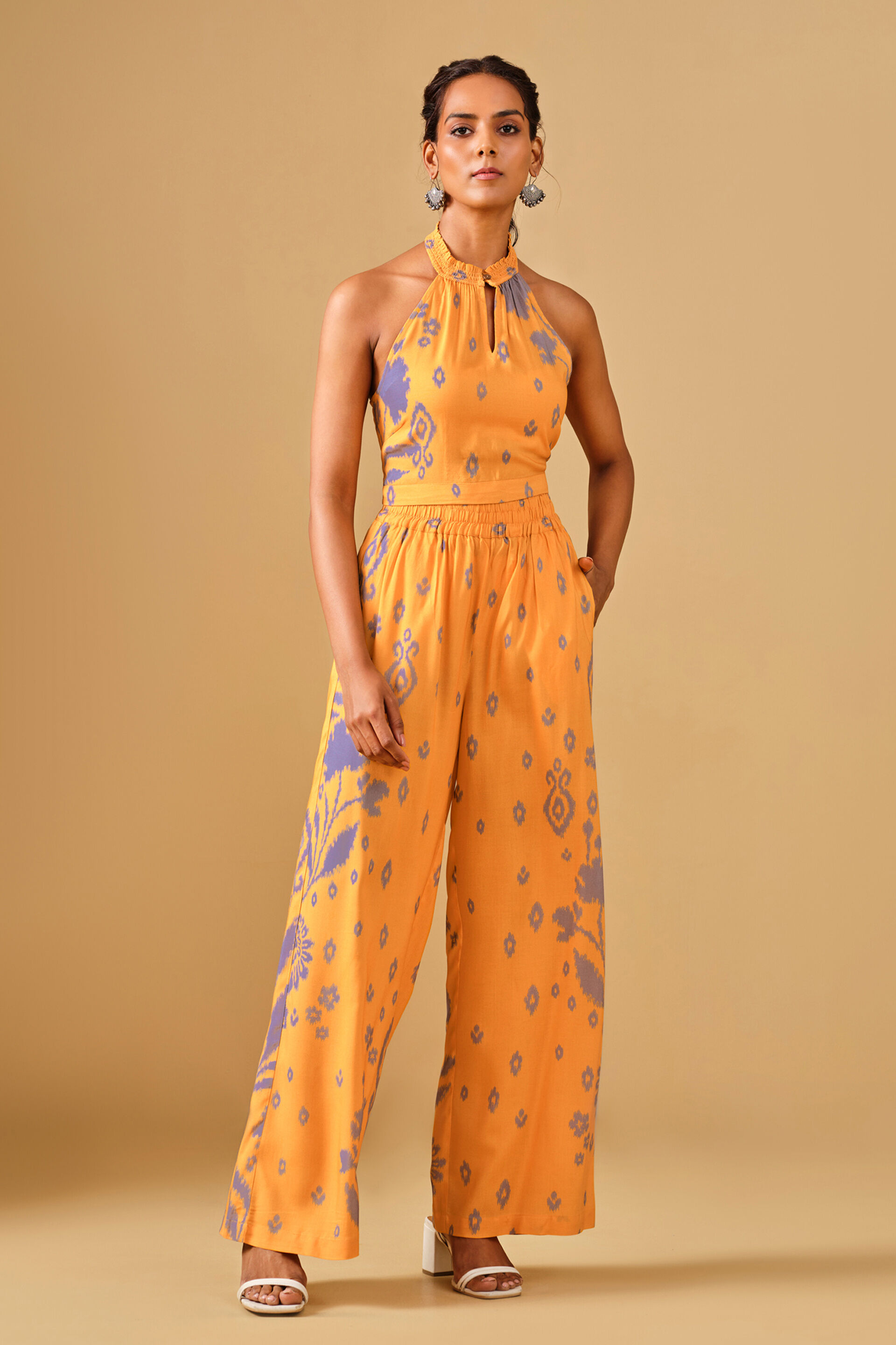 Bring home the sunshine with this playful 2-piece co-ord. Featuring bold Ikat inspired print, this co-ord has a lightly smocked halter-neck crop top silhouette and wide leg pants with a smocked waist to match. This co-ord has been crafted using 100% viscose.